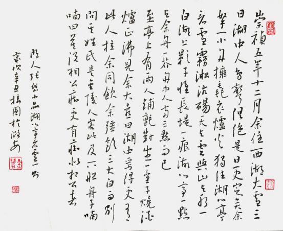 不安排不造作,不故意不拘泥,人书俱老,把书法写的炉火纯青,这是闫接囤先生书法修养的境界,起笔落笔完全脱离了书匠的窠臼,走进了书以抒情的精神层面,极大地放开了书法作为艺术门类的审美表现力。一件小品《湖心亭看雪》行书作品,取法二王所凝聚起的晋韵风范,也有宋意书风的浑然天成,以文人心境驾驭笔墨节奏,写出了诗的意象,亦有词的灵动,果然是下笔可到乌丝栏的代表作品。从审美的角度来看,这样的行书作品美若琼花玉蕊,给人以赏心悦目的视觉魅力。从收藏的角度来论,这样的书法作品因为有着书法龙脉的可贵内涵,贵如和璧隋珠,实为不可多得的收藏臻品!