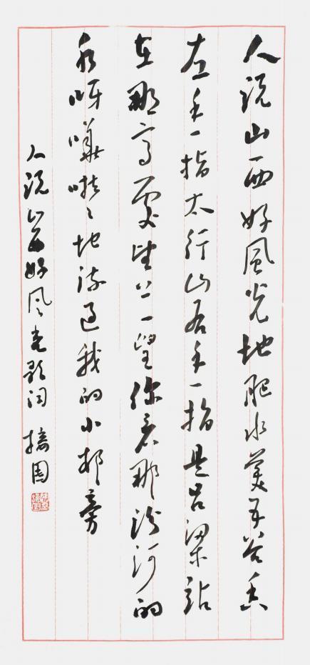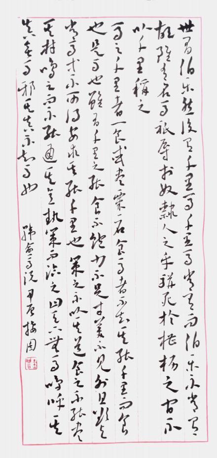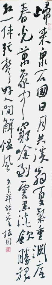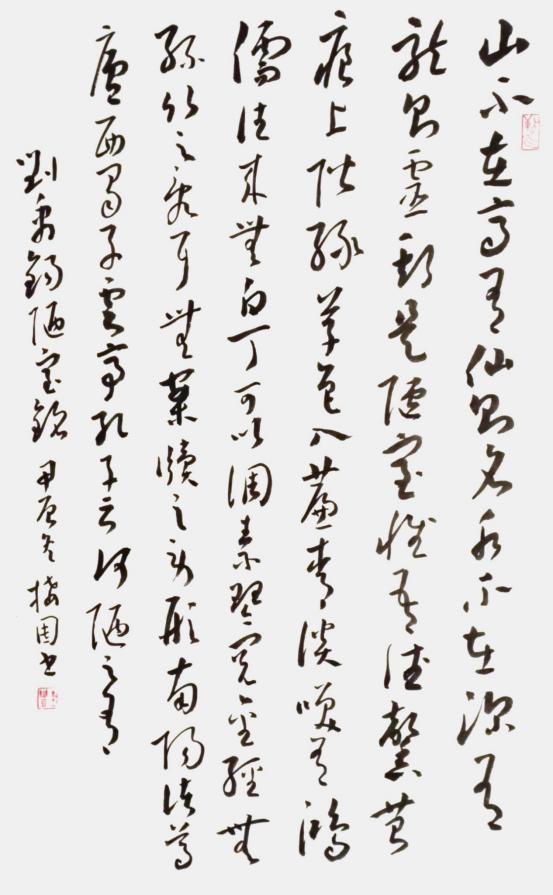 书以载道,传承文脉。草书是书法里的王冠之珠,闫先生历练草书、创作草书亦可以摘得明珠,写得草书气象万千,丰姿多神,一划之间变起伏于锋杪,一点之内殊衄挫于毫芒。墨池飞出北溟鱼,笔锋杀尽中山兔,刚柔相济,绵里藏针!他的草书以软质长毫书写,极见控笔运墨的能力,凌空杀纸,力透纸背,写得类万物之象,既有飘风骤雨惊竦竦的动感,也有落花飞雪何茫茫的诗意。无论是《沁园春 长沙》还是《辋川闲居》都写得气势与气韵双佳,亦是文人书法的飘逸风雅。执笔作书八面出锋,落墨铸字一代大家!