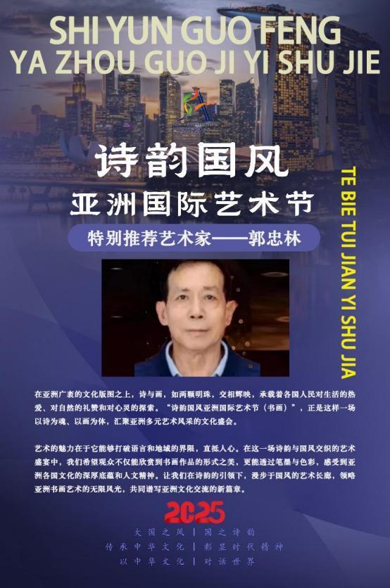 郭忠林,国家高级美术师,最具收藏价值艺术家,国家特级著名书法家、一级美术师。原藉河北成安人。1949 年生于郑州,1992 年~1995 年毕业于中国书画函授大学。1998 年就读于山东省艺术研究院书法研究生班。现任中国书法家协会会员:中国国家书画院荣誉院长;中国著名书画家协会副主席;国际 1SQ9000A 书画艺术家资格认证中心副主席;中国书法家美术家艺术创作中心教授;中国艺术研究院艺术中心刨作员,近十余年在多次参加国际、国内大型活动中特别等级奖、金奖、二三等奖 50 多项!并入编由中国文学艺术界联合会、中国邮政联合发行的“二十世纪中国书画名家精品”纪念邮册(入编康有为齐白石,吴昌硕,于右任,黄宾虹,郭忠林作品“千禧龙福”以纯足金箔压轴)。被授予北京奥运会杰出艺术家,中国当代实力派行书名家;慈善艺术家;中国文联名誉顾问,被授予“德艺双馨艺术家”“盛世中华,百杰艺术名家”荣誉称号,纪念联合国成立 75 周年的国宾礼的作品选了郭忠林美术作《龙梦》。这幅作品与中国人的包容精神分不开,具有很强的进取精神。郭忠林的作品《龙梦》10 月 24 号作为国礼烧制在景德镇白瓷盘上,精品包装礼盒代表国礼赠送给联合国。也是世界上仅有一份。收藏价值和纪念价值都是非常高。鉴于郭忠林在中华艺术领域所获得的杰出成就,授权郭忠林同志作品为国宾礼。2023 年著名人文书画家郭忠林先生,在第二十届精神文明建设“艺心向党,红船精神”评选表彰活动中,获得“红船精神传承人物”荣誉称号,其事迹及作品将在 CCTV13新闻专题中进行宣传报道。2023 年 10 月特授予“大国外交文艺使者”荣誉称号!2023年被百年巨匠书画艺术博物馆首席签约艺术家,2023 年 10 月被授予“大国外交文艺使者”荣誉称号,中国共产党中央委员会宣传部颁发名誉顾问聘书。