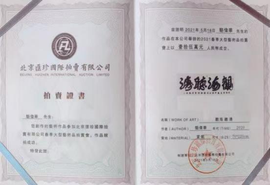 2021 年 5 月 18 日骆伟华先生的作品《观海听涛》在北京汇珍国际拍卖有限公司举办的 2021 春季大型艺术品拍卖会上以 壹拾伍萬元人民币成交。