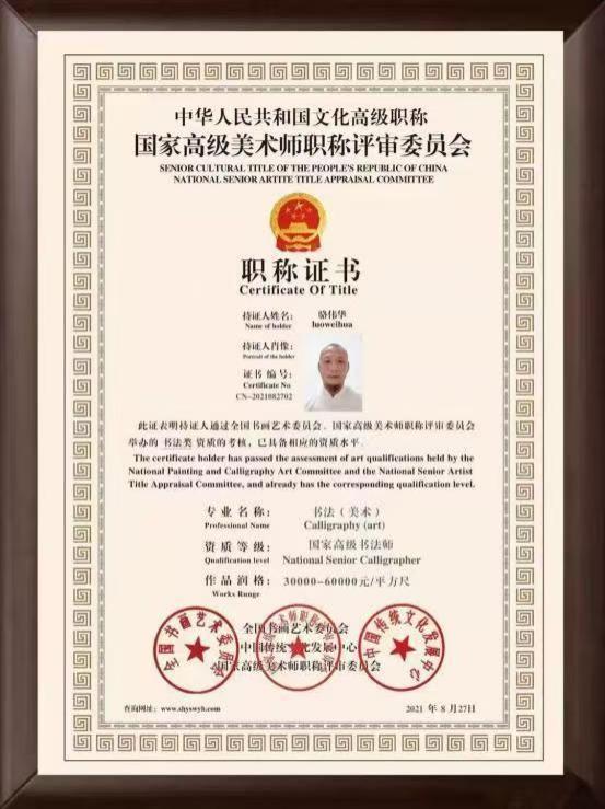 2021 年加入名家艺术联盟签约书画家,红年华书画馆常务主任。2021 年 8 月被入选(中国文化高级职称,国家高级书法师)荣誉。现为香港特别行政区文学艺术界联合会(会员)