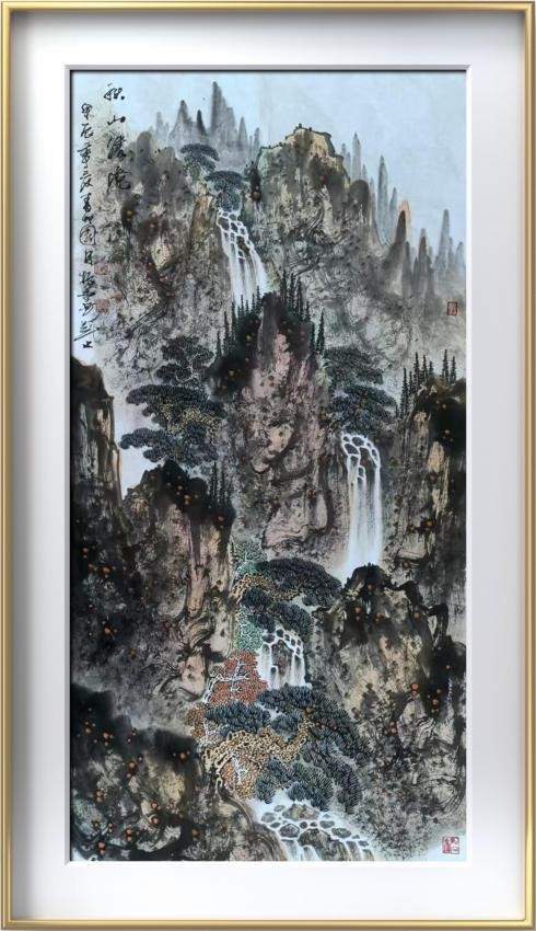 《秋山飞瀑》尺寸:150*45cm,纸本设色。