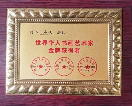 2025 年 2 月一带一路文化旅游促进会和影响世界十大金牌艺术家组委会授予“影响世界十大金牌艺术家”称号。