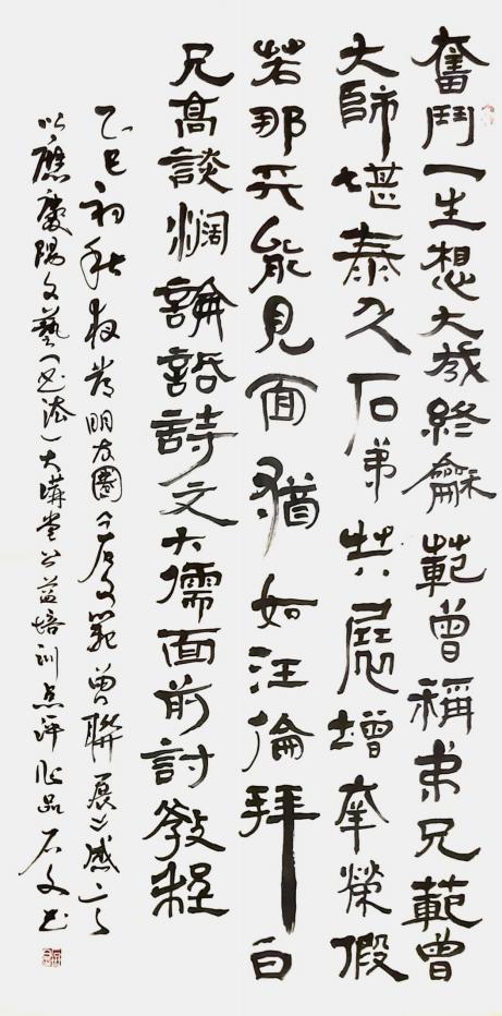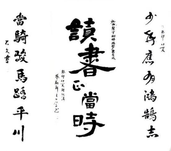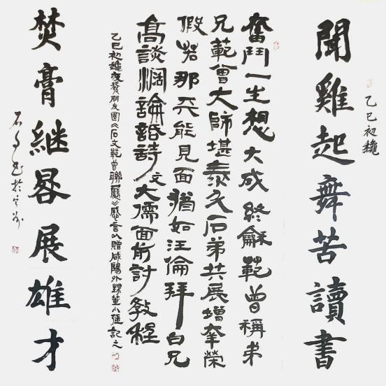 石文的书法突破始于对传统范式的解构与重构。在 2011 年文化部国展冲刺班期间,他系统梳理了历代碑帖的经典范式,却未止步于技法复制。这种学术自觉在 2013 年中国书协西部基地的研修中愈发清晰,他开始尝试将《张迁碑》的拙朴与《祭侄文稿》的奔放进行跨界融合,在隶书的横向拓展与草书的纵向跌宕间寻找平衡点。