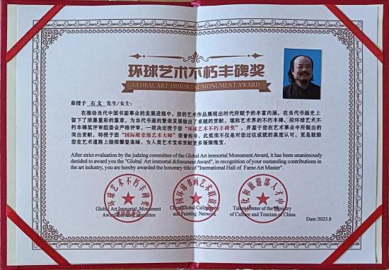 石齐白——首届中国艺术金马奖!在这个充满创意与灵感的时代,艺术以其独特的魅力,不断激发着人们的情感与想象力。艺术不仅是文化的瑰宝,更是民族精神的体现。它跨越时空,连接着过去与未来,承载着人类共同的追求与梦想。首届中国艺术金马奖评选活动,旨在表彰中国当代艺术领域作出杰出贡献的艺术家。石齐白先生用自己的才华、努力和创造力,推动了中国艺术的发展,丰富了中华民族的文化内涵。我们再次见证了艺术名家石齐白的辛勤耕耘与卓越成就。他的艺术作品,拥有不同的艺术风格和创作理念。石齐白先生技艺精湛,更在传承与创新中不断探索,为中华文化的传承与发展做出了重要贡献,更是当代最佳书画导师!