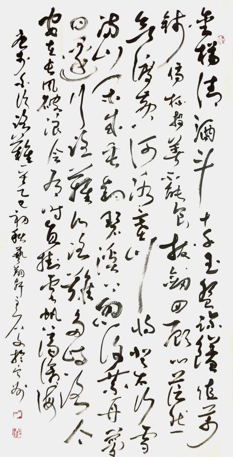 "陇东狂人"的艺名背后,是石文对书法精神的深刻理解。其狂草创作既非简单的情绪宣泄,而是经过理性控制的生命表达。2021 年被嘉德艺术馆收藏的《李白诗》作品,通过笔势的跌宕起伏与墨色浓淡的戏剧性变化,将诗仙的浪漫主义精神转化为视觉张力。这种创作理念在 2022 年"最具时代风采艺术大家"评选中获得理论界认可,评委会特别指出其作品"在传统法度中注入当代知识分子的精神关照"。