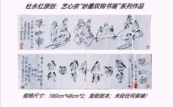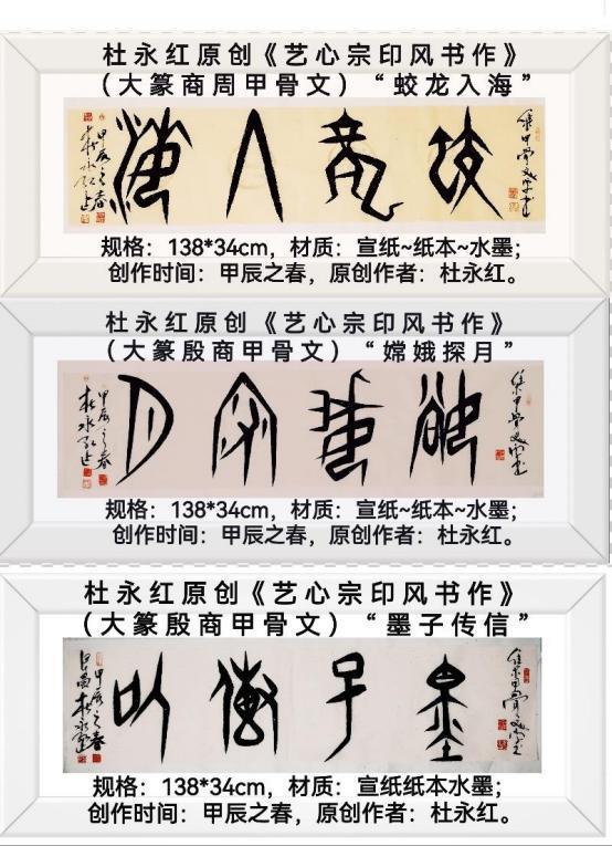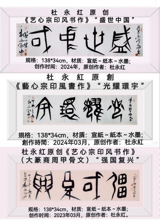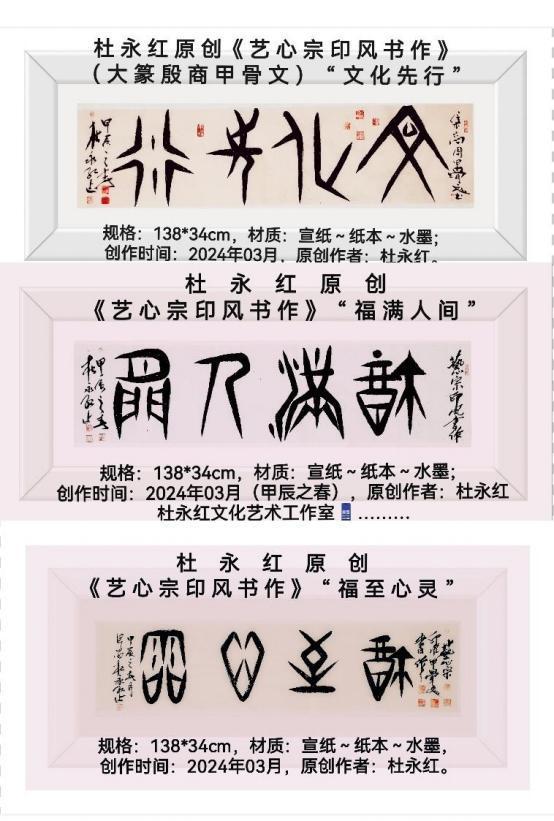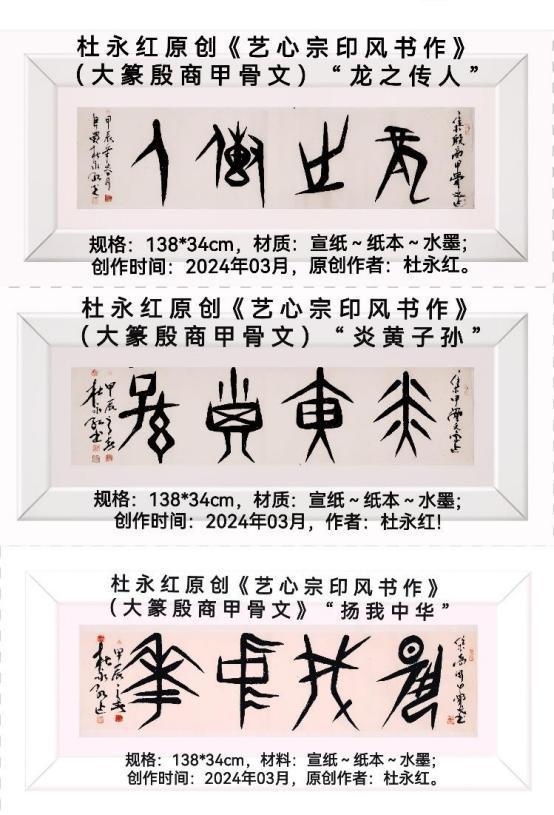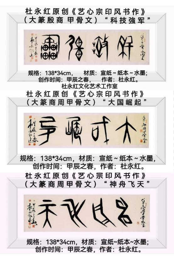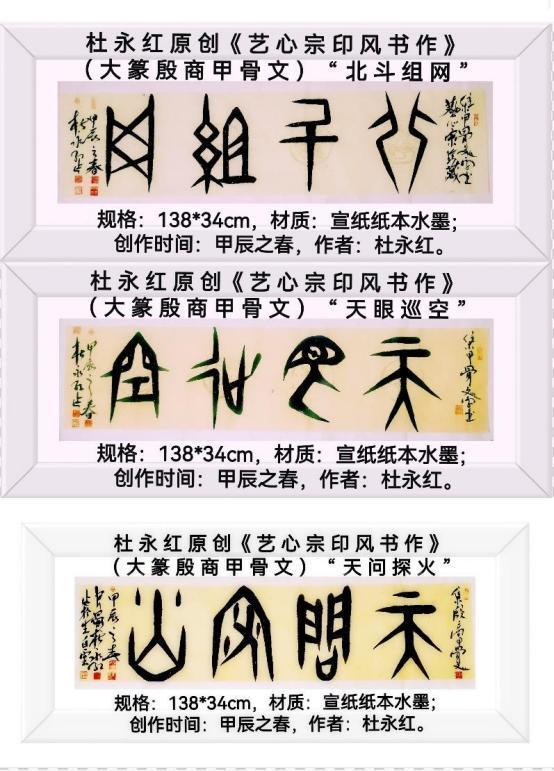 杜永红创作的我国艺心宗“妙墨双钩”象形文字书画,象形寓意地开创了独具匠心的一派风格,其形象韵味穿透古今,荟萃了众家之长,象形舒缓,字美意深,不失古文明的原味,容纳今世浩气的王者风范,拓展了祖国传统艺术,并汇聚融合了国画、书法、篆刻与爱国情怀和个人情感,开辟了独树一帜的一派卓尔不群的:我国(国际)艺心宗文化艺术。其韵味悠远,妙不可言!撼动灵魂,这真是一门迈向明天迎接回来的艺术,可堪称东方艺海一绝。