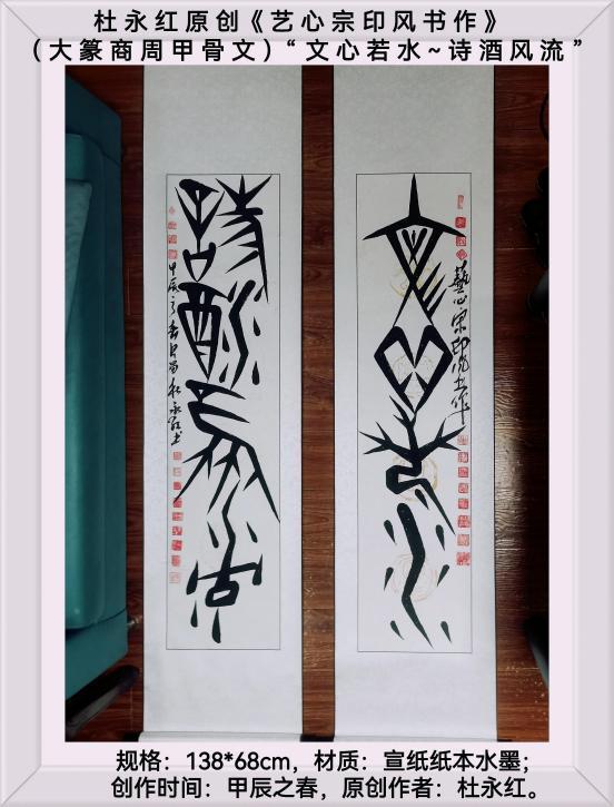2025 年 6 月著名书画篆刻艺术家杜永红原创《艺心宗印风书作》(大篆商周甲骨文四言联)“文心若水~诗酒风流,在香港汇烽 2025 年春季拍卖会上以6270 万元拍卖落锤成交。