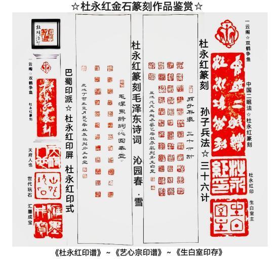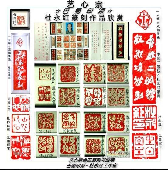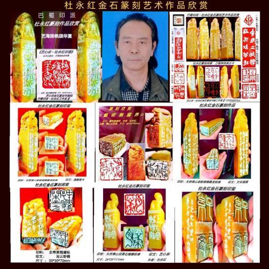 著名书画篆刻艺术家——杜永红先生,1963 年 7月生于四川~犍为,民族:汉族,籍贯:重庆。祖籍:山东~滨州~杜氏一脉。自幼授祖父杜伯坚(笔名:二眠先生、皇济人、老济、系我国金石八大家之一巴蜀印派宗师)与刘天倪(国学大师王国维嫡传弟子)等前辈先贤亲传身教,深授我国传统文化艺术熏陶,酷爱诗词歌赋与金石篆刻书法绘画。勤究历代诗书画印,长期刀耕笔种,笔耕不辍,其作品甚丰。