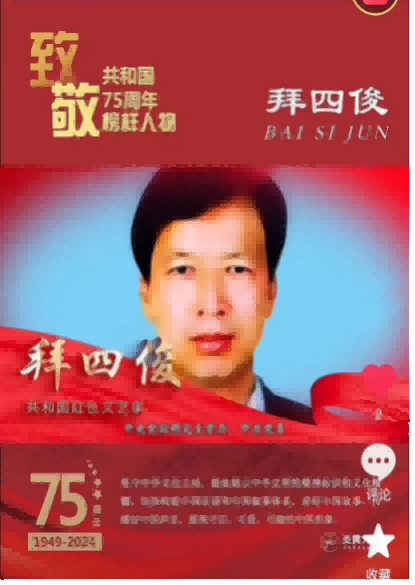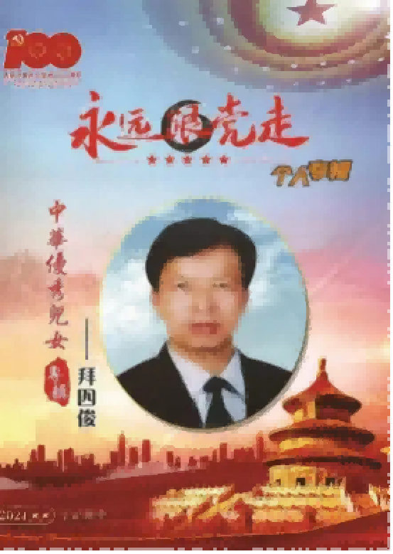 2024年,入选决策中国栏目联合中国影响力人物数据库编撰出版“中国梦,百年潮——2024行业影响力人物”典藏挂历12人之一;入编中国评纶出版社《时代骄子》,入编纪念伟大领袖毛泽东主席诞辰130周年,中国科学文化出版社《大国榜样》专刊、光大出版社《鲜红的旗帜》《鲜红的旗帜•共和国前进路上的擎旗手——拜四俊》专刊。