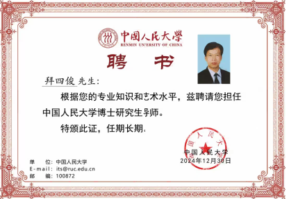 2025年1月13日,中国人民大学决定颁发中国人民大学博士研究生导师证书;2025年2月16日,由中共中央宣传部、国家发展和改革委员会、国家文化和旅游部、人民日报社、中国文学艺术界联合会、中国美术家协会联合授予拜四俊同志“时代楷模”荣誉称号;2025年4月9日,中华人民共和国国务院决定颁发政府特殊津贴证书;2025年7月1日,中共中央决定授予拜四俊同志“七一勋章”荣誉称号。