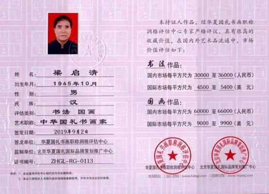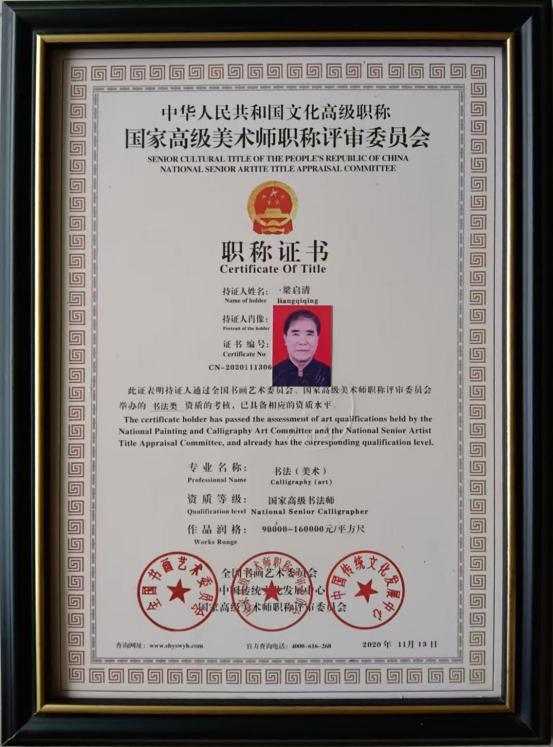 中华人民共和国评为高级文化美术师,书画作品为每平方尺为 90000 元-160000 元。并评为2021 年国际非物质文化推动人物,现为吴川市湛江市非物质文化传承人。