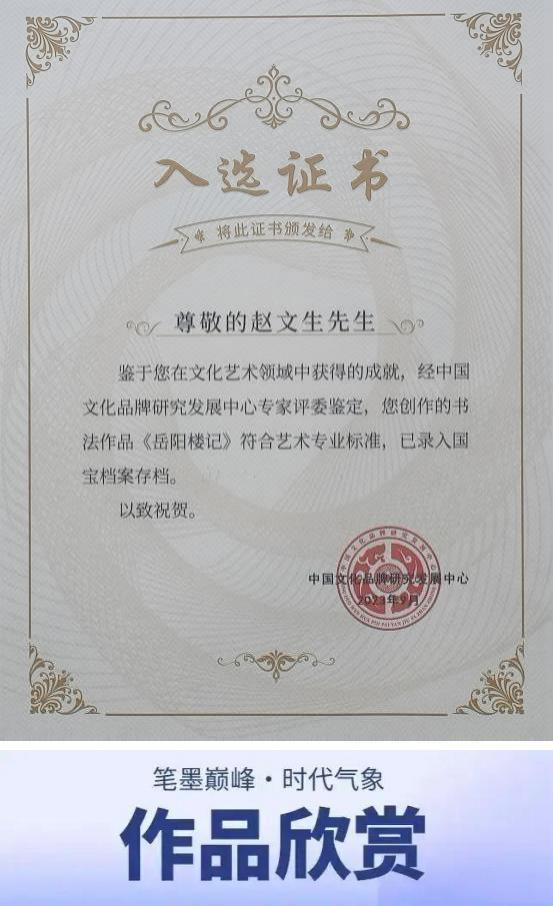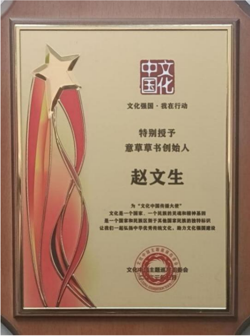 先后获得“世界和平艺术贡献者”奖。获西班牙皇家艺术协会、毕加索故宫博物院、巴塞罗那艺术学院联合颁发的“优秀导师”奖。获国际金牌艺术家及中国艺术首届金马奖。2025 达芬奇国际艺术奖金奖。艺术中的诺贝尔奖获得者。“金砖艺术家”。胡润全球艺术金笔奖。全国“五个一工程奖”。“孔子奖章艺术顾问”。被人民日报授予“新时代书画艺术先锋人物”。草书得到范曾、薛永年教授极高的评价。先后有多本教材、专集,合集在全国发行。多次走进央视并登上笔尖下的中国栏目。作品分别在北京机场候机厅,高铁站,首都地铁展播,影响国内外。被授予当代最具收藏和艺术价值的书画家。先后被中宣部授予“时代楷模——笔尖下的中国赵文生”;被文联授予“全国艺术劳动模范”称号。被文旅部授予“共和国艺术楷模”荣誉。被中书协,中美协等授予“人民书画家”称号。同年被央广国际文化交流艺委会授予“中华文化品牌人物”。2023 年“文化中国传播大使”特别授予<意草书法创始人>。长卷《岳阳楼记》被专家评审团授予国宝并被国宝档案存档。2024 年受邀中国教育电视台录制“欢乐中国年”节目。2025 年国宝长卷<岳阳楼记>等二幅作品被推介到阿拉伯国家。被中视文化产业聘为“书法评论家”。