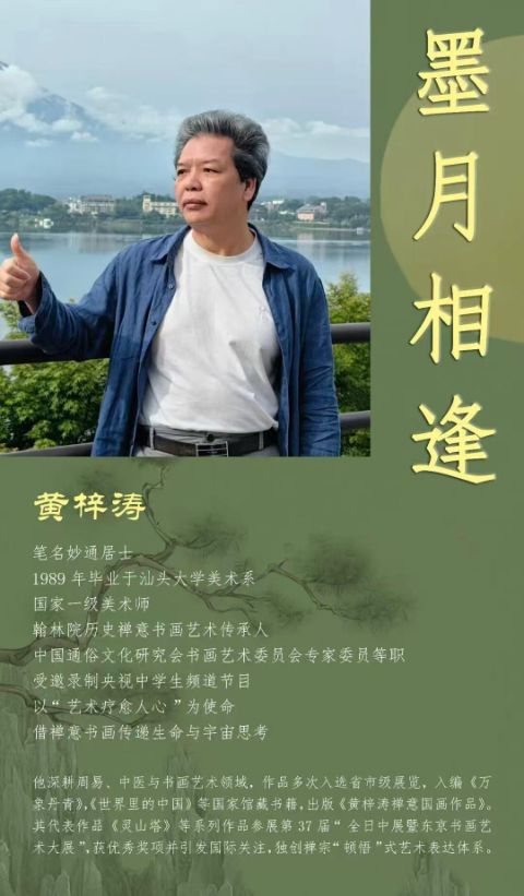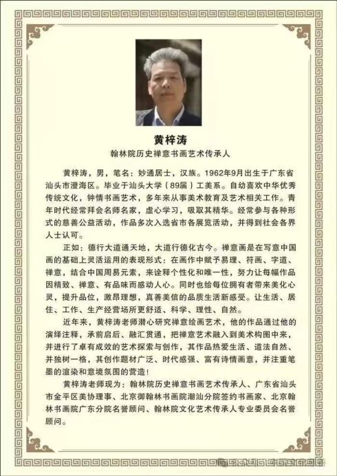 黄梓涛老师现为:翰林院历史禅意书画艺术传承人、中国通俗文化研究会书画艺术委员会专家委员,湾畔创大艺术学院院长教授,国家一级美术师,广东省汕头市金平区美协理事、北京御翰林书画院潮汕分院签约书画家、北京翰林书画院广东分院名誉顾问、翰林院文化艺术传承人专业委员会名誉顾问。上过央视学生频道,梓涛先生(妙通居士),学儒、体道、悟佛,擅长翰墨丹青,用艺术唤醒生命,所谓:梓墨含古意,涛声逸趣情;妙趣入圣境,通达禅人生。其禅意书画,自成一家,其作品始终把“艺术疗愈人心”的创作理念贯穿其中,生动活泼的感染力使人能找到内心的平静与力量,从而使人达到身心灵全方位健康的境界。更是传达出对生命、宇宙的深邃思考,引导观者探寻内心宁静与心身灵平衡,智慧与觉悟。同时也给观者带来无尽的回味与探研,震撼与赞叹!更是传达出对生命、宇宙的深邃思考,引导观者探寻内心宁静与心身灵平衡,智慧与觉悟。同时也给观者带来无尽的回味与探研,震撼与赞叹!更是传达出对生命、宇宙的深邃思考,引导观者探寻内心宁静与心身灵平衡,智慧与觉悟。同时也给观者带来无尽的回味与探研,震撼与赞叹!更是传达出对生命、宇宙的深邃思考,引导观者探寻内心宁静与心身灵平衡,智慧与觉悟。同时也给观者带来无尽的回味与探研,震撼与赞叹!更是传达出对生命、宇宙的深邃思考,引导观者探寻内心宁静与心身灵平衡,智慧与觉悟。同时也给观者带来无尽的回味与探研,震撼与赞叹!