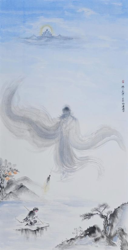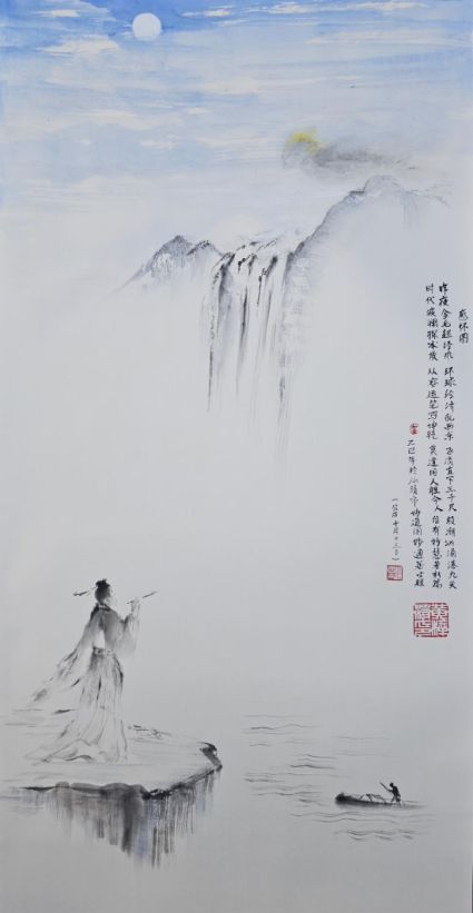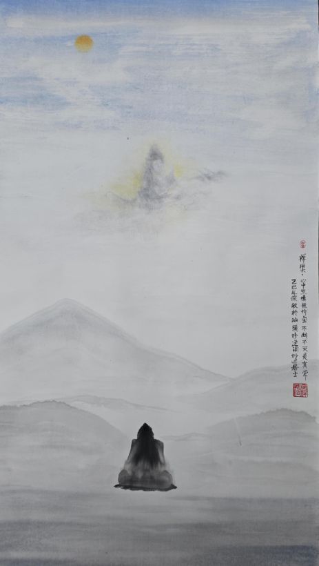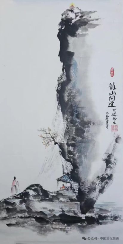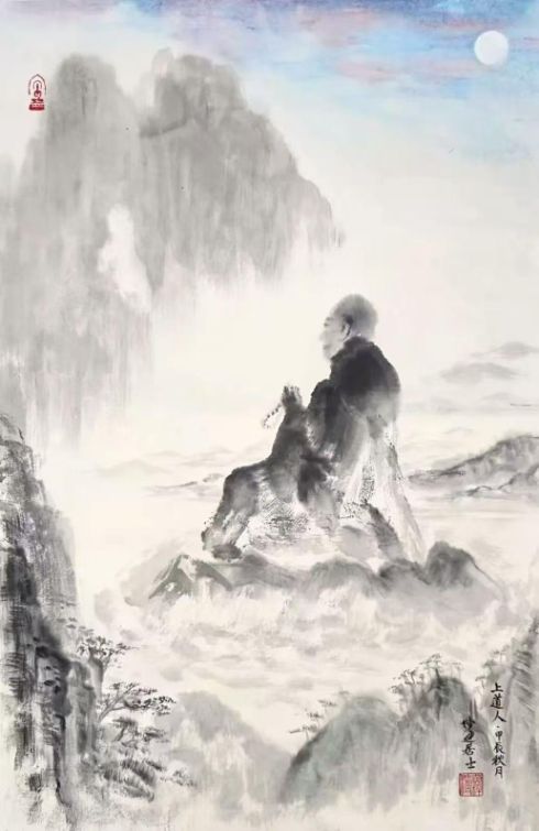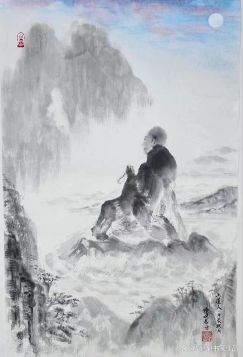 如果说《灵山塔》以“简”见禅,《上道人》则以“境”传意。画中,一位道人坐于谷底,四周群山环伺,明月当空,清风似有若无地拂过衣袂。黄梓涛以淡墨晕染山体,用干笔皴擦出岩石的质感,又以精准的笔触,控墨的适度(尺度)以及大气度笔力将上道人,人物张显得羽羽如生(活灵活现),虚实之间,营造出“空山无人,水流花开”的意境。“画里的道人不是‘旁观者’,而是‘融入者’。”他引苏轼《赤壁赋》注解:“耳得之而为声,目遇之而成色——对于悟道者而言,山、月、风都是心的投射。看山是山,看山不是山,看山还是山,最终是‘山即是我,我即是山’的物我一体。”这种对“心物关系”的哲思,让画面超越了自然景观的描摹,成为一场静默的“禅修”。