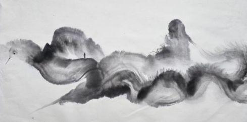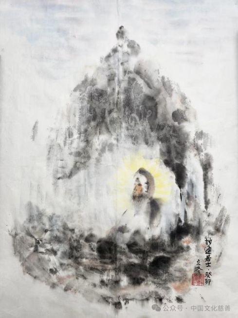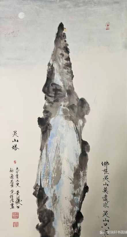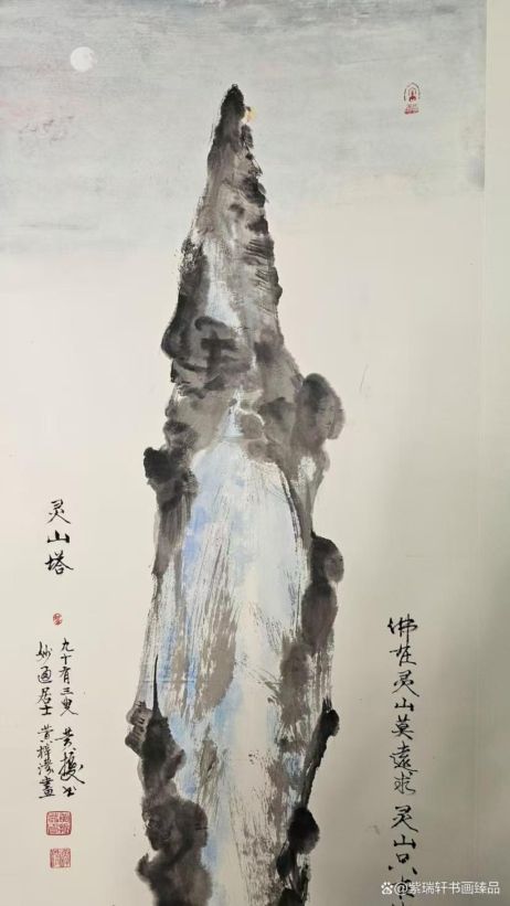 《灵山塔》是一幅人物主题水墨画。画面中,一位僧者立于山巅,身后塔影朦胧,云气缭绕。与传统人物画“勾勒线条、层层渲染”的手法不同,黄梓涛以“一笔成形”的果敢笔触塑造人物:衣纹的转折、面部的神态,均以简练精准的墨线完成,每一笔都带着书写的节奏,无复笔、无修改。“我追求的是‘当下即永恒’——笔尖落下的瞬间,既是对物象的捕捉,也是内心的流露。”他解释,这种创作方式看似“随意”,实则需要数十年的功底支撑:“没有对结构的深刻理解,没有对墨色的精准控制,一笔下去可能就‘散’了。”画面整体虽简,却因笔意的连贯与墨色的层次(浓墨提神、淡墨染气),呈现出“疏可走马,密不透风”的艺术效果。日本水墨评论家佐藤美子观后感叹:“这不是简单的‘写意’,而是‘写心’——笔锋里藏着画家对禅意的悟,对生命的敬。”