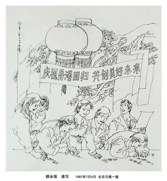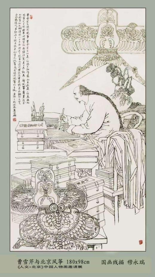 作为新闻美术速写大家,穆永瑞为首都的昨天留下了太多令人记忆犹新的京人、京事、京味儿。出自他笔下的全线条历史连环画《三十六计》《资治通鉴》《史记人物》等。至今为当代中国连环画界津津乐道。最为瞩目的“大速写”当属亮相中国美术馆的《曹雪芹》:六尺整纸之上,正埋头专心致志绘制老北京风筝的曹雪芹完全忘了世事变幻。岁月漂白所有的颜色,唯有线条清晰地保留下旧时民俗影像,垂直的线演变成搭在椅背上的长衫大褂儿,横长竖短的线叠探成高高低低的书堆,唯有手上笔尖欲点未落令画中人颇为费心.....或.是已经完活儿的三个大风筝太精美。或许是画里画外的人物太有名,加上线描国画在净化笔墨时所产生出的特殊韵味,一经展出,马上就有风筝协会表明收藏意愿。