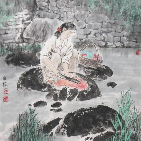 村姑洗衣图 68X68cm