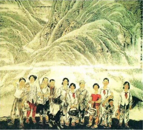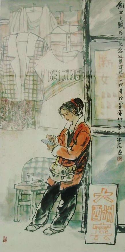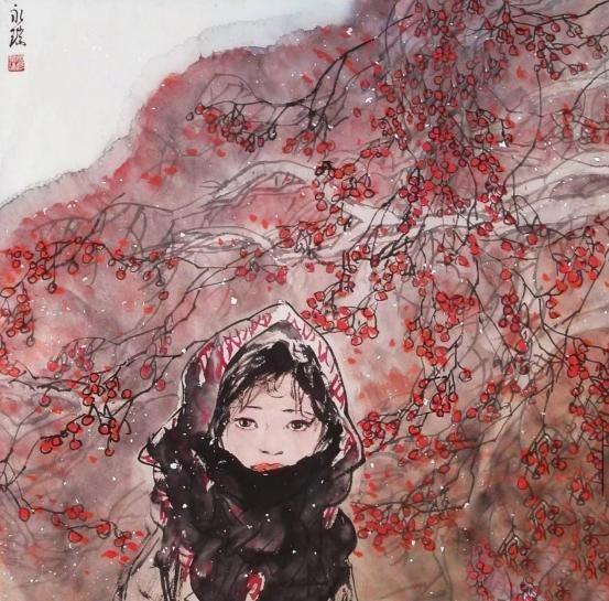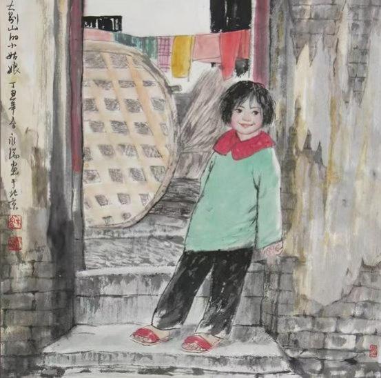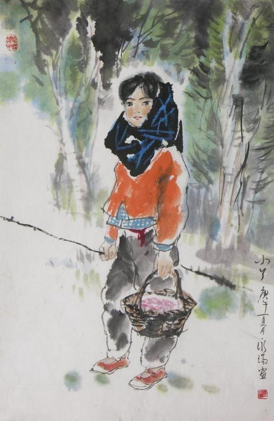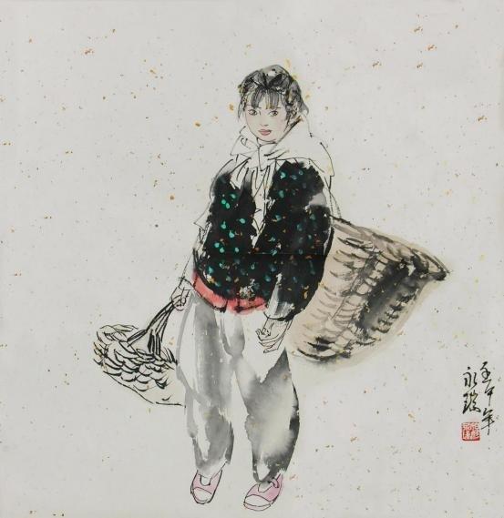 美在创新,难在自然。从新闻美术到国画创作,穆永瑞独辟“社会新闻、生活见闻,历史传闻”艺道一途,多年来笔无稍停。“小村姑”作为他的代表性系列作品,已成为中国画坛一个极具人性美的新人物形象。其中,被反复刊载的《村姑肖像》至今依然甜美怡人,她那为人熟悉的侧眸、一好奇的清澈眼神,使人瞬间放下所有的心思,只想从苹果初红般的圆脸蛋上,多看一眼多揣摩一番能让她如此天真美好的生活境遇。为使笔下人物具有属于自己的审美观并自我提升,他在形象和性格创造上赋予了她们完全的自主性,无拘无束,率性而活,因而看来疑画亦真。他画的多是背放羊带拾柴的小村姑,她们唯一的背景就是村里村外的山野大树,沿着“大京九”一路写生至今,属于她们这个年龄特有的天真、向往和希望深深打动了他,正是这画笔难仿的人性自然美,让人物懂得了如何以美面世,也让穆永瑞再难放下关爱之心。大凡一个画家,如没有真正意义上的理解,人物形象就不会自己活起来。在红色革命题材的创作上,穆永瑞同样喜欢以“小”见大。应多地革命纪念馆之邀精心绘制的小红军主题作品,不仅显示出他独到的艺术视角,更将中国工农红军从小到大的初始阶段通过个性鲜明的艺术形象再现于世。比起刚在土石墙上刷写完“红军万岁大标语,转身以灰军装、八角帽、红五星尽显革命本色的小女兵,大树上手持红缨枪瞪大双眼的小哨兵,百倍警惕中,同样透出一抹青春洋溢的气息。用画笔为曾经的革命历史开拓出一个展示红色大美的艺术空间,是穆永瑞在战争题材创作上的显著特点,我们看到,当红色岁月成为一种特定历史背景,革命并非只有残酷两字,透过一个个宽皮带扎得紧紧的小身板儿,还有那黑色短发衬托出的小脸蛋儿,军威依然难掩纯真本性。正是人物形象和感情上的真实无虚,使得穆永瑞的“小红军”在还原历史同时,成为红色革命史诗中一个英姿飒爽的美丽音符。