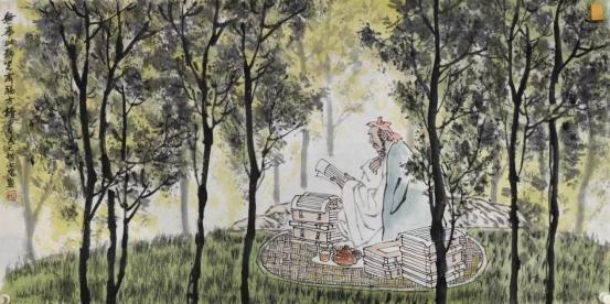 相比用艺术美化红色革命的青春色彩,穆永瑞的历史人物画则多了满纸书卷气,所求一读一解一悟,劝学,明史、立人。百般《劝学》与三更《秉烛夜读》外,他的红衣达摩一扫传统笔下的情态,尝以不动之形蕴含激荡之心。如面壁后的悟道新解令达摩祖师愈显境界通明,虽仍合目求索但已气度非常,感觉随时都会破壁而起,风行天下。此外,他还在历史人物画构图上开创出“反黄金分割法”和一画多构式。前者人物往往处于黄金分割法的反向位置,致使形象格外醒目,或背蕉书写,或背山独思,巧将一一身置之度外:后者可见丈二巨制《观瀑图》,一图多构所产生出的山象、松象、气象和人物形象的自生自立却又和谐一气,使历史、自然与人重构曾经的旷古一瞬。唯有人物背后双松扶摇,一明一暗,中间半截松干鼎立,将另一巨松几欲破画而出的风动之势稳稳撑起,复再细赏,整体构图中每个局部都有自己的完美构图,云聚浩气之境,山立重开之界..
