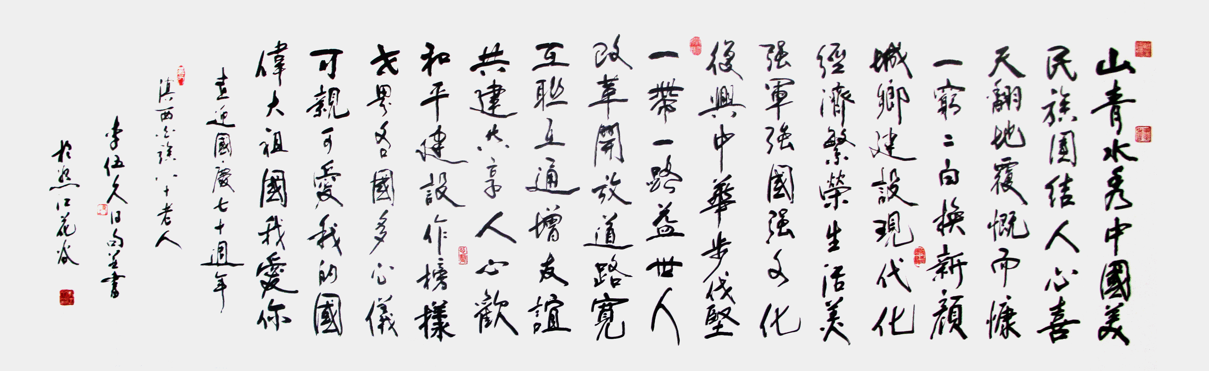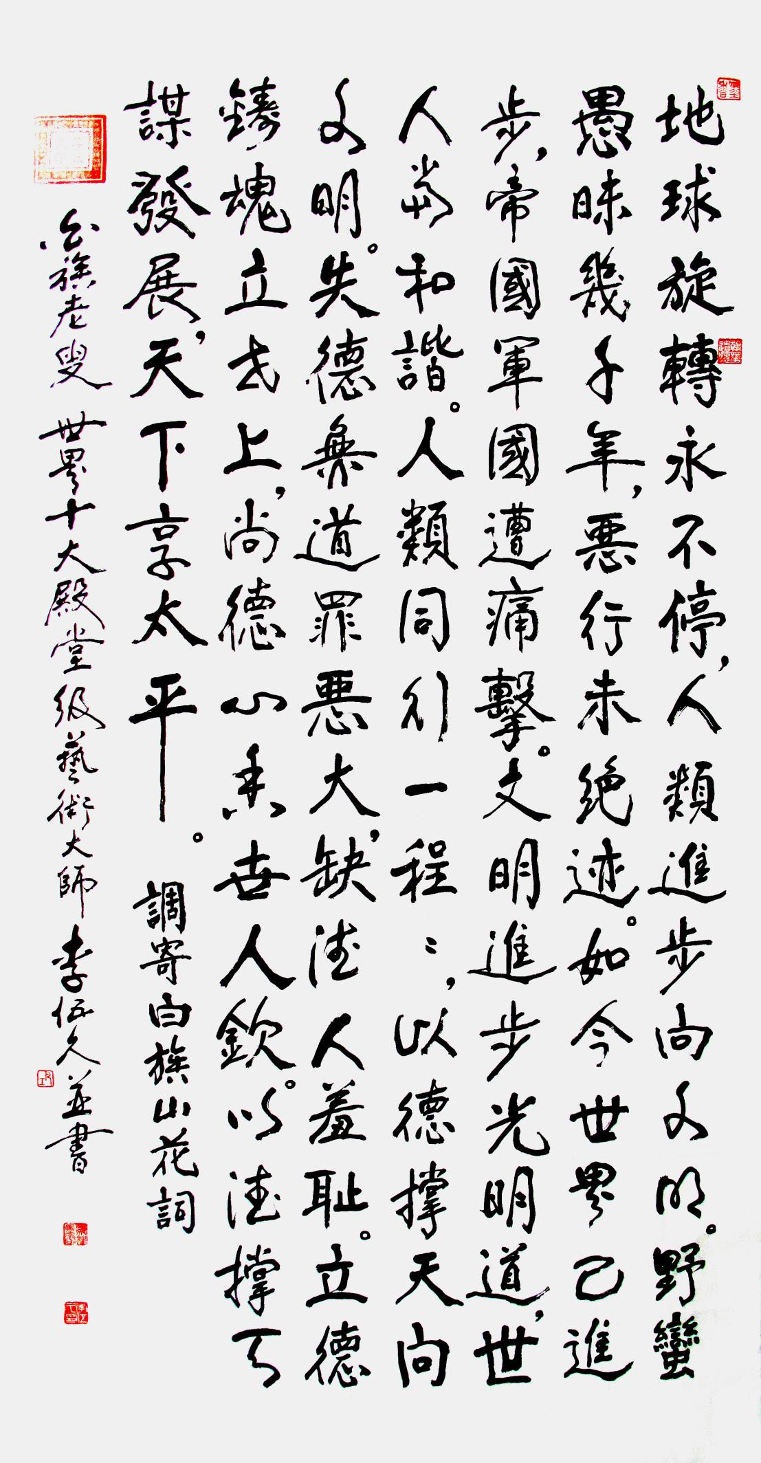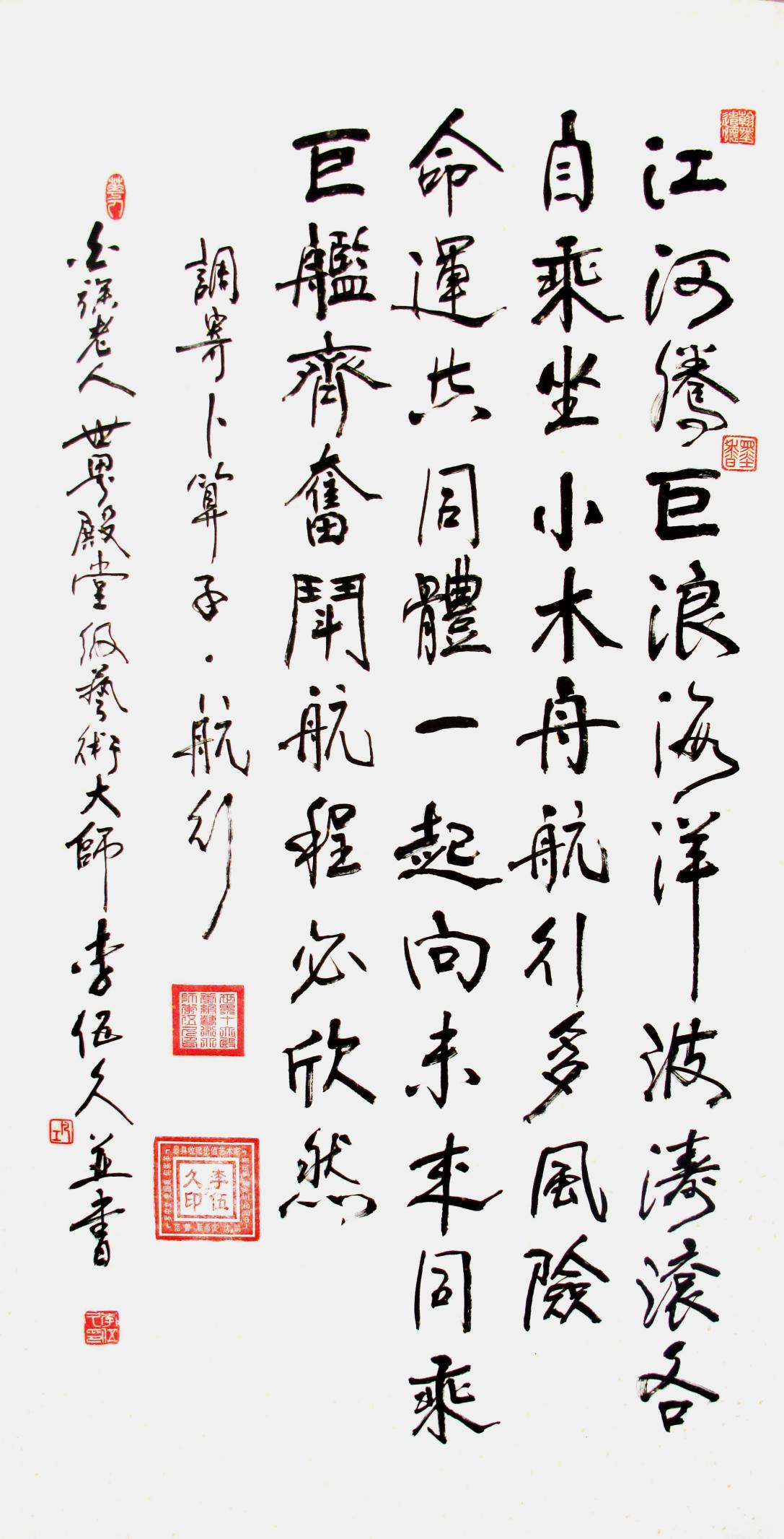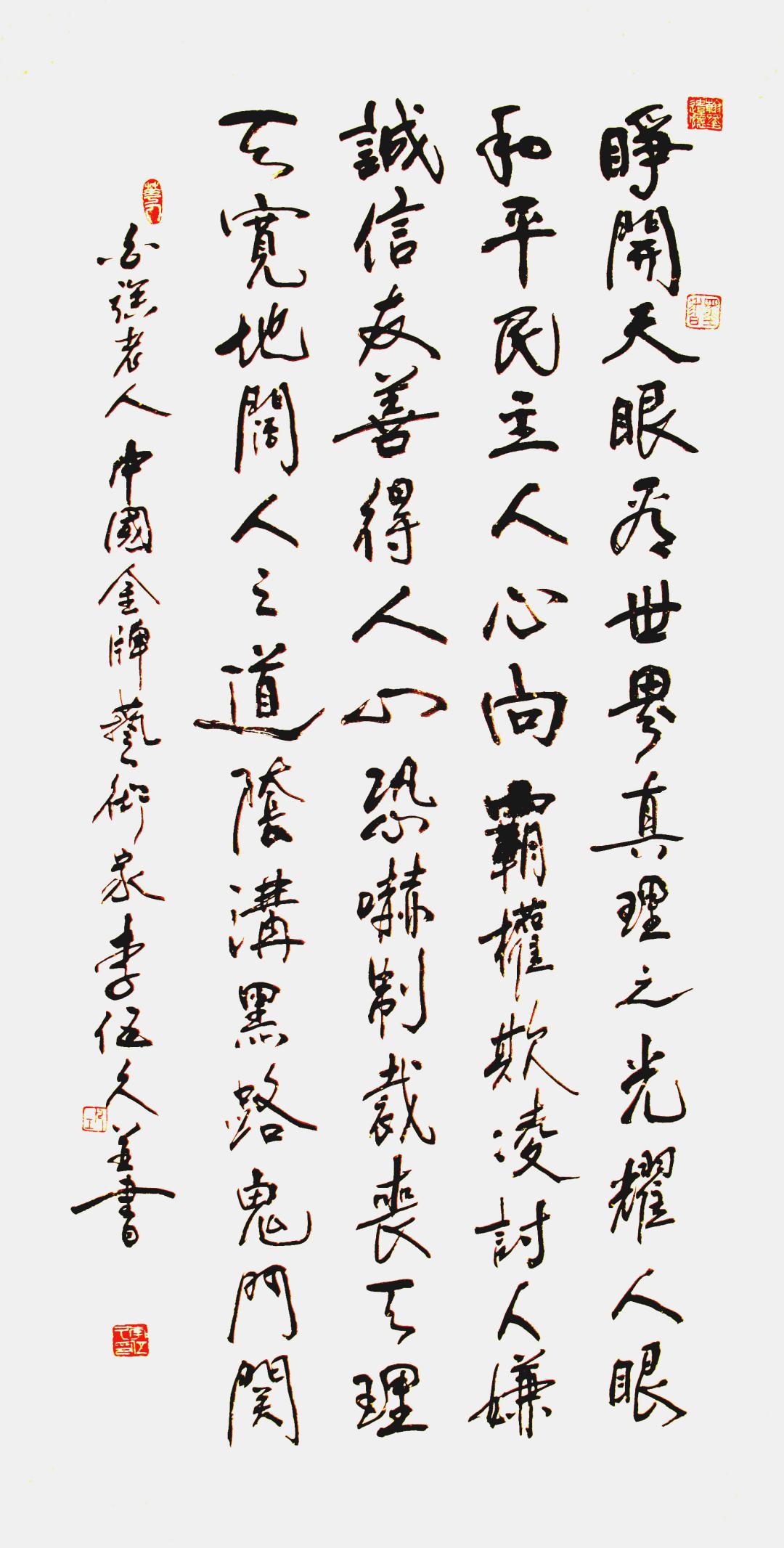 佛经有句话讲:“人生的行囊里面,真正装着属于你自己的东西,那是你对人生的体悟;假如你没有,最后会发现自己就是一个空空的臭皮囊。”李伍久将他运用到书作中,把每个字看作一个生命单位,有神、气、骨、肉、血,五者缺一不可。细观之,其以情入笔,不计工拙,无拘无束,时有纵情豪放,一泻千里;时有老辣遒劲,杂以流丽;时有镌若石刻,妙如天造;时有意气淋漓,浑然天成。古人云:“清风出袖,明月入怀”,真正达到了一种随心所欲而不逾矩的境界。真可谓:端庄大方重有骨,一张一弛皆有度。道法自然万归一,精益求精不流俗。(2019.2.)