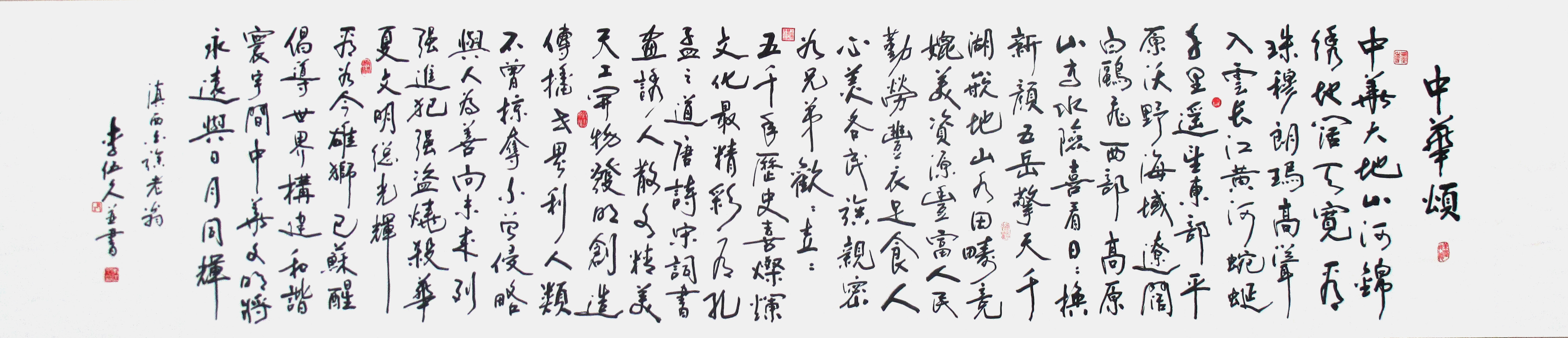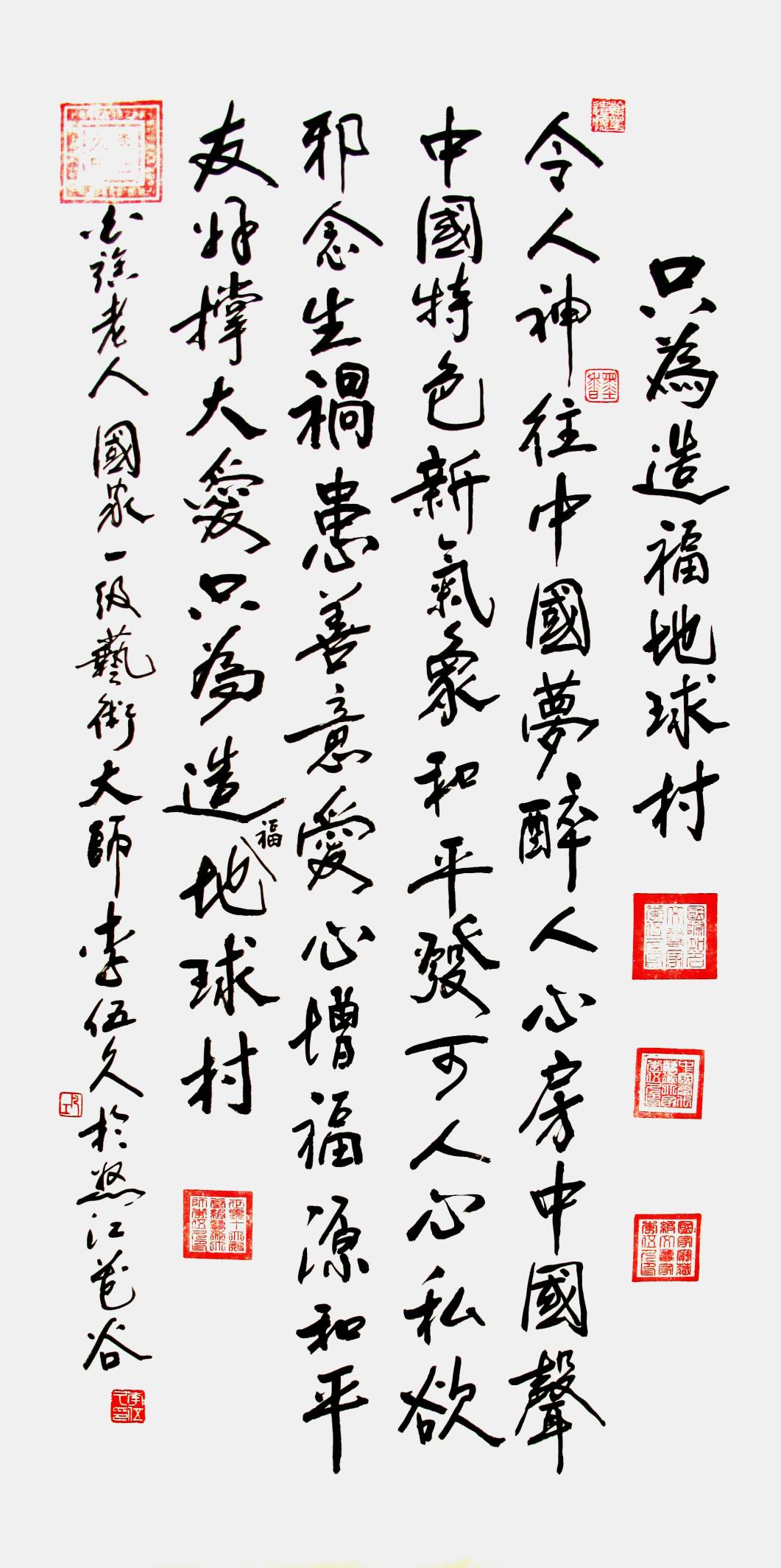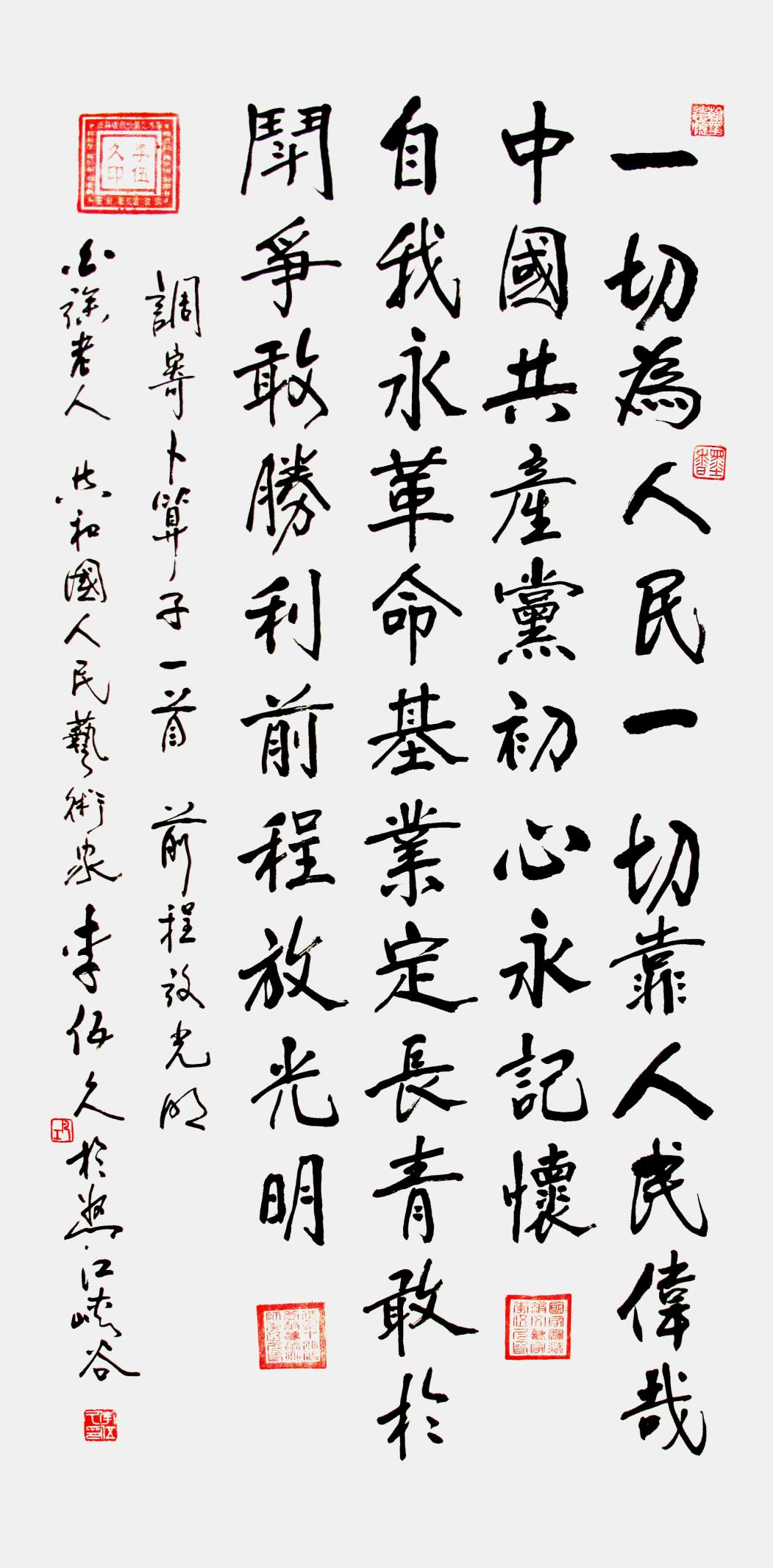 李伍久,白族,1938年9月5日生,云南剑川梅园人。大专学历,中共党员,中学高级教师,一生支边怒江从事教育工作,先后荣获云南省“先进教育工作者”“先进教研究工作者”荣誉称号。业余喜文乐艺,有新诗、詩词、歌曲、歌舞、散文、童话、小说、书画、教育、家教、詩书论文等多种作品问世,并多有获奖。出版了新詩集《边陲横笛》《岁月之声》《新时代放歌》,散文集《面对生活》《片马之歌》,詩词集《古琴新曲》,书画作品个人集20种,入编《中国书画金奖作者风采》等重要典籍40多种。先后荣获“詩词名家”“国家一级艺术大师”“国礼特供艺术家”“共和国杰出艺术家”“共和国人民艺术家”“共和国金牌艺术家”“中华国礼书法大师”“人民书画家”“国务外交礼品师”“联合国和平艺术家”“联合国和平书画院终身院士”“联合国教科文组织艺术顾问”“全球十大最具影响力文艺家”“中国十大最具收藏价值艺术家”“世界十大殿堂级艺术大师”“全国高层次文艺大师”“国家优秀文艺人才”“国家战略储备人才”等荣誉称号,荣获莫奈国际艺术奖金奖、蒂亚诺杯国际艺术大赛金奖,跻身世界殿堂级艺术大师序列。2020、2022、2023年三次被特邀将本人书法作品随同习主席的重要图文出版为贺岁台历。还被中国书协孙晓云主席称之为“是继王羲之、颜真卿之后在中国书法史上最具影响深远的大师,堪称艺坛巨匠,千古一人”。不胜荣幸!