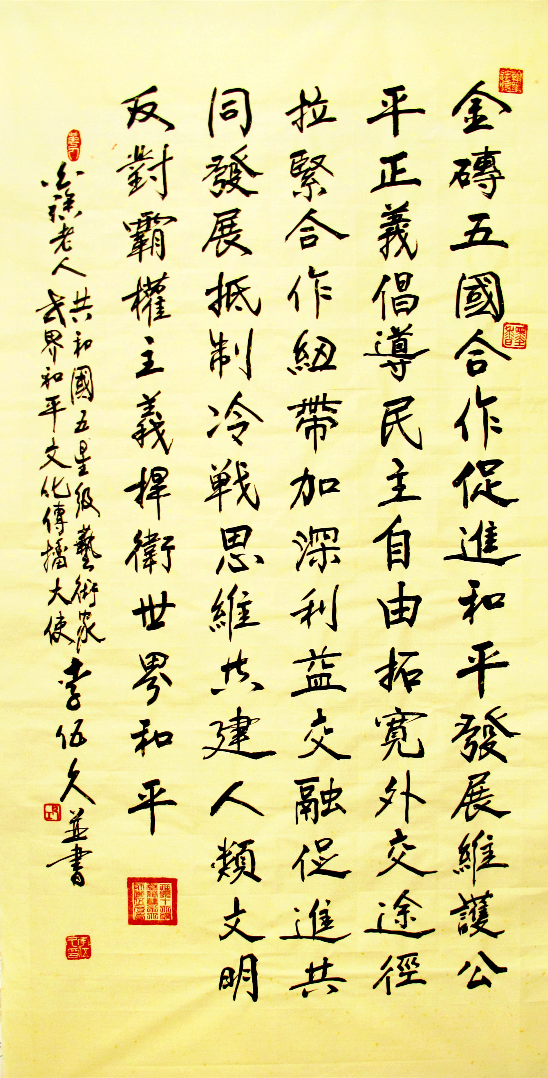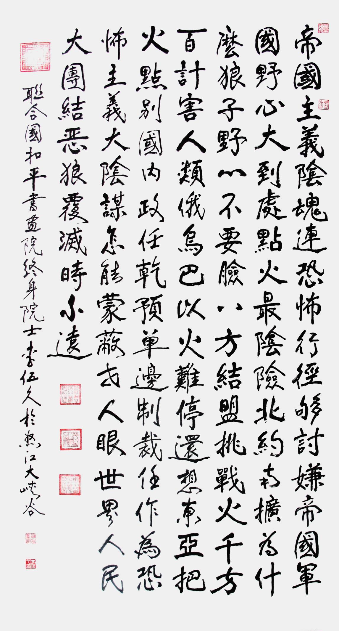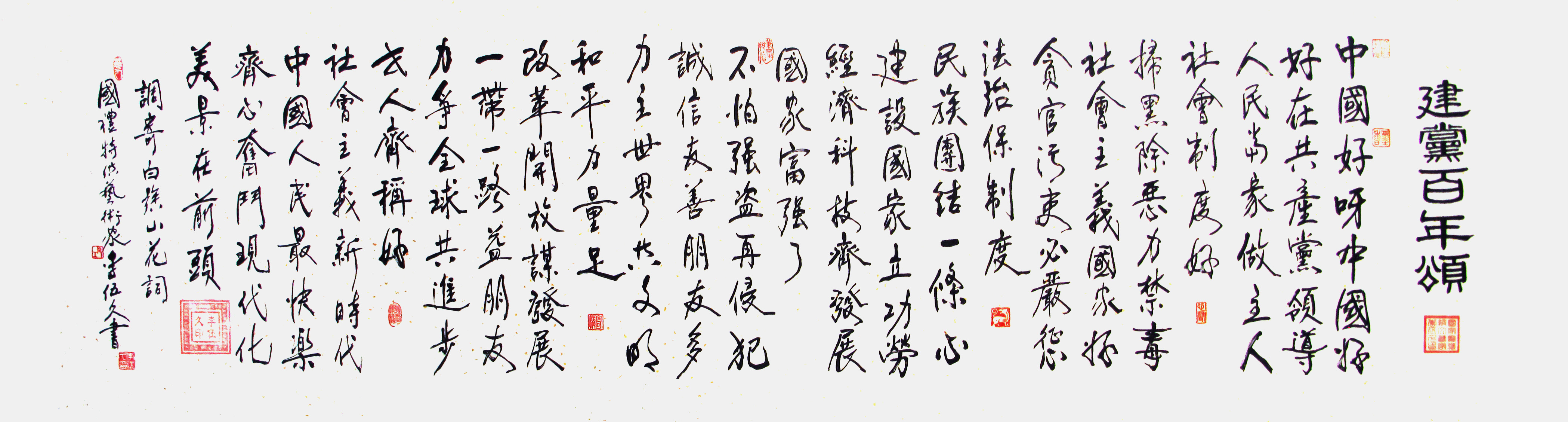 李伍久,白族,1938年9月5日生,云南剑川梅园人。大专学历,中共党员,中学高级教师,一生支边怒江从事教育工作,先后荣获云南省“先进教育工作者”“先进教研究工作者”荣誉称号。业余喜文乐艺,有新诗、詩词、歌曲、歌舞、散文、童话、小说、书画、教育、家教、詩书论文等多种作品问世,并多有获奖。出版了新詩集《边陲横笛》《岁月之声》《新时代放歌》,散文集《面对生活》《片马之歌》,詩词集《古琴新曲》,书画作品个人集20种,入编《中国书画金奖作者风采》等重要典籍40多种。先后荣获“詩词名家”“国家一级艺术大师”“国礼特供艺术家”“共和国杰出艺术家”“共和国人民艺术家”“共和国金牌艺术家”“中华国礼书法大师”“人民书画家”“国务外交礼品师”“联合国和平艺术家”“联合国和平书画院终身院士”“联合国教科文组织艺术顾问”“全球十大最具影响力文艺家”“中国十大最具收藏价值艺术家”“世界十大殿堂级艺术大师”“全国高层次文艺大师”“国家优秀文艺人才”“国家战略储备人才”等荣誉称号,荣获莫奈国际艺术奖金奖、蒂亚诺杯国际艺术大赛金奖,跻身世界殿堂级艺术大师序列。2020、2022、2023年三次被特邀将本人书法作品随同习主席的重要图文出版为贺岁台历。还被中国书协孙晓云主席称之为“是继王羲之、颜真卿之后在中国书法史上最具影响深远的大师,堪称艺坛巨匠,千古一人”。不胜荣幸!