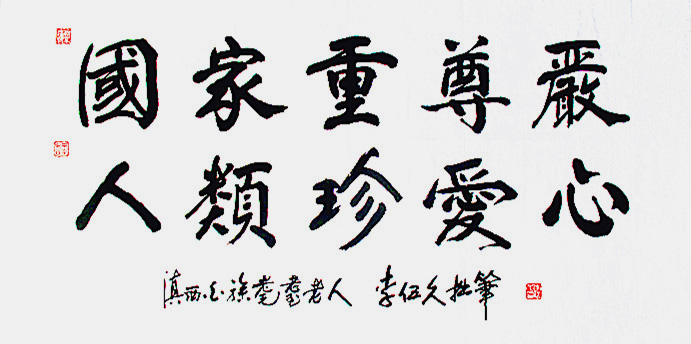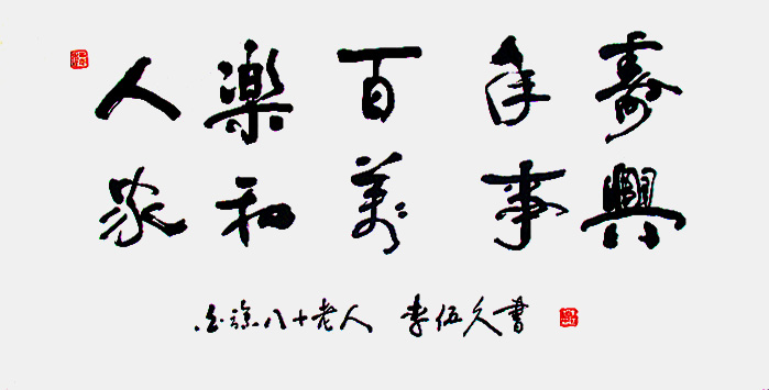 文人书法家李伍久,在修碑帖成大功之后,笔不为自悦,而是常为歌盛而挥纵,他不但是一位有文化担当意识的艺术家,还是一位有社会奉献意识的大手笔。一幅《中华颂》盛情笔墨成欢歌,一幅榜书《龙》大气渲染中华精气神。他的书法,是文人品质,却不显文人之弱,大得文人风骨的坚韧,不以文人戏墨为小界,却以风骨立功勋。书法一界有此前辈,仰观成灯塔。导向之功,倍受敬仰! (2018.6.21.)