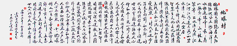 李伍久把草书、楷书、汉碑、汉隶、行草等字体集中变形,融汇于一体;同时结合大草的笔法使得作品连绵不断。其笔触,毫不拘泥概念化的规范,而是随手生发,或中或侧,或方或圆,或藏或露,或敛或纵,触处成形;其结体,则善于随形布势,或铺张排比,或敛聚收放,甚至依倚穿插,应心隐手。在具象与抽象中,展现出中国书画同源的艺术精髓;在山形云影,风帆飘动中,诠释着中国文字博大精深的象形表现力。这样的结合使文字变得有金石铁声,飘逸洒脱,大气磅礴,自然合道,宛若天成。而这种独特的书写风格,则促成并终而奠定了他在书坛坚不可摧的独立地位。 (2020.12.22.)