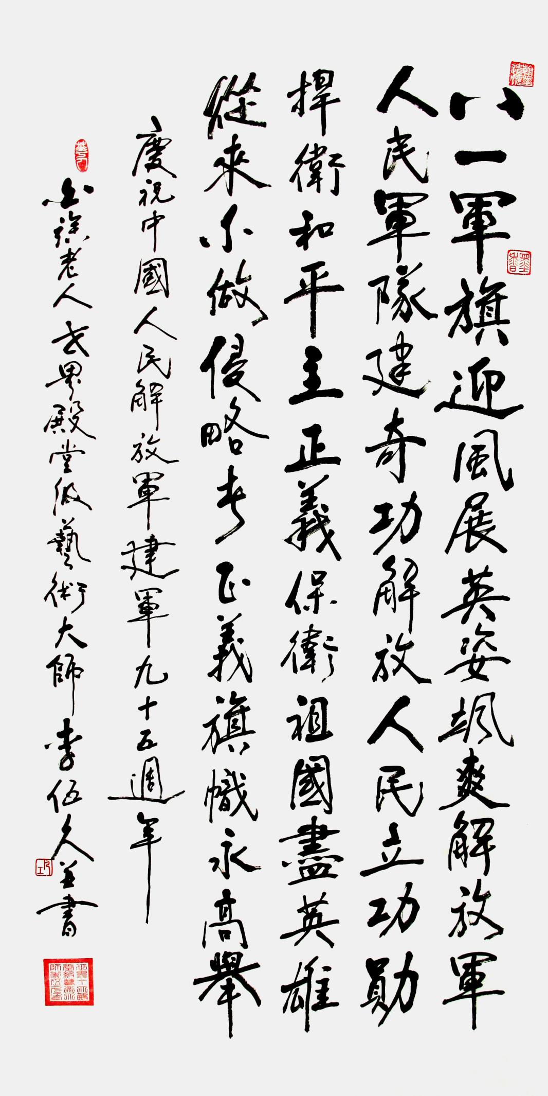 李伍久老师的书法艺术,是中华传统文化中的一支奇葩。其作品中蕴含的神韵、气势、骨力、丰润与血性,五者相辅相成,共同构筑了其书法的独特魅力。在李老师的笔下,每一个字都仿佛被赋予了生命,它们不仅仅是文字的载体,更是情感与思想的深刻表达。