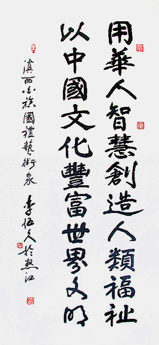 李伍久讲:“书法必须与文学联姻,才能产生内容与形式俱美,使人乐于欣赏的书法艺术。真正的书法家,也应该是思想家、文学家。只会照葫芦画瓢地写字的人,只能称写字匠,而不是书法家。”