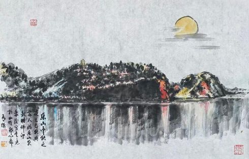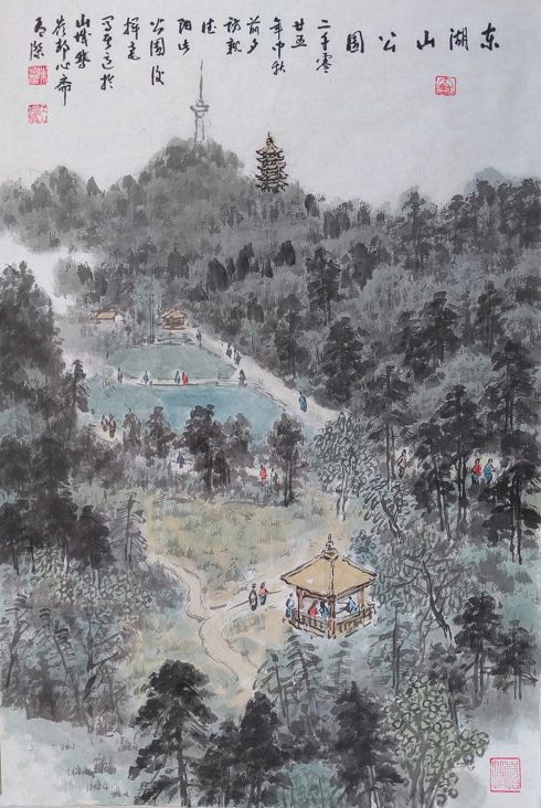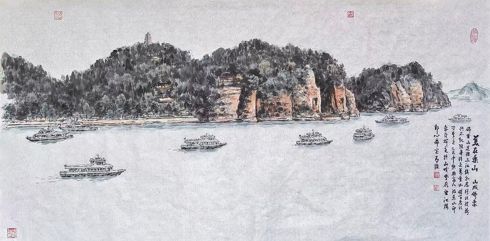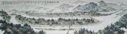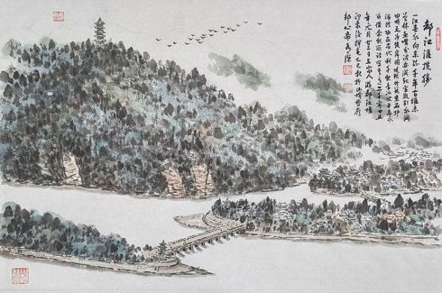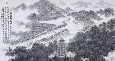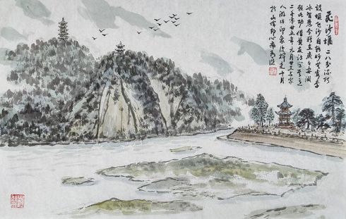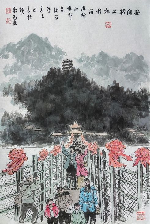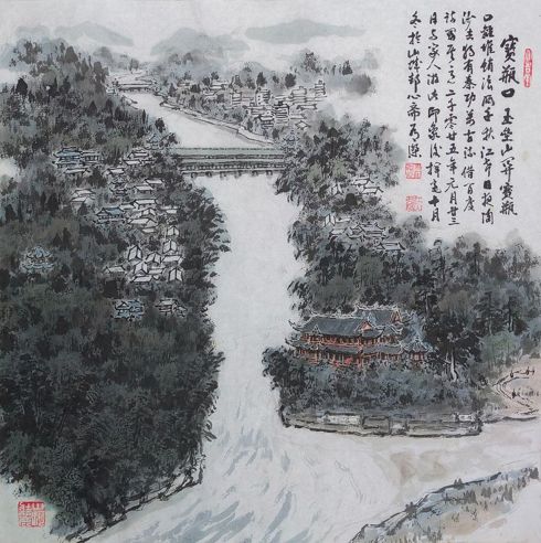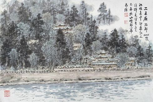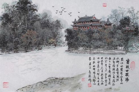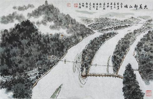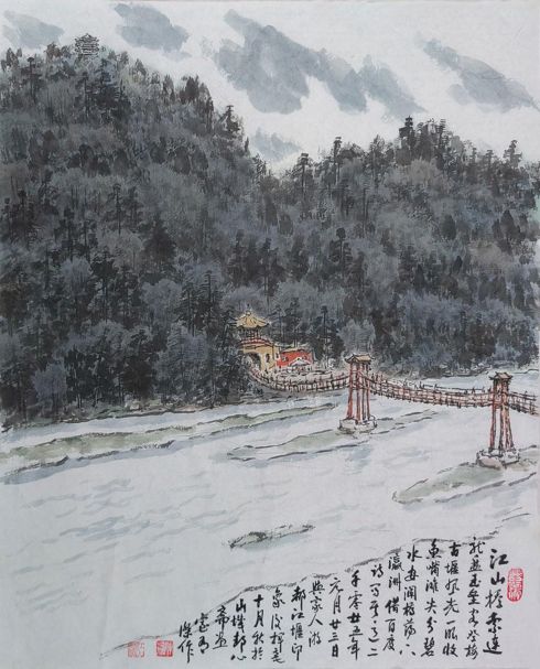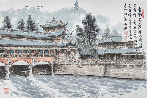 元月 23日乘车去都江堰市区住宿看市容夜景,品赏当地鲜鱼美食。下午与家人乘车上山来到秦堰楼观景台,俯视远眺都江堰上下全景,其恢宏气势千古水利工程景象尽收眼底,因游客很多,等侯找了好的位置便分段拍照,待以后再作写生素材。接着便从楼上下山来到安澜索道处,踩着悠悠晃晃的索桥过河,下索桥来到都江堰鱼嘴观景台,看上流江水到此鱼嘴河坝处,听导游讲外江内江水如何在此分流,古人先贤李冰成功治水的智慧与功德无量造福川人的故事。此时虽是冬季,江水虽少但也能见河段江流之缓慢与湍急。我们从鱼嘴处离开后沿江边向中下游走去,在内江河段一路拍照,可见内江左边密林深处的二王廟楼阁房舍,远山高处的玉垒阁隐约可见,穿过密林又在外江边看河水沙滩,后来到飞沙堰亭台处稍息拍照,再转一湾来到离堆与宝瓶口处,江边宏伟壮观的楼郭亭台像一颗定盘宝珠屹立,这里河段突然变窄,水深浪急,但江水到此一迂回便驯服自然向下的成都平原流去,余后我们又过桥来到幽静的离堆公园休息一会,出园再去繁华热闹古色古香的南桥画廊,仰天窝老街河巷参观,余后我在《仰天窝一角》画里自撰题画诗一首曰:"青砖黛瓦灰壁墙,飞檐翘角似凤凰。细刻精雕走兽马,民风古朴呈吉祥。”不虚此行,是这座美丽的都江堰山水小城给我留下了美好的记忆,后根据照片印象,我用中国画的平远,高远,深远法反复构图经营位置,突出重点,大胆取舍,笔墨色彩虚实相生,从不同角度表现都江堰的风貌,让静态的山水画,亭台楼阁画里有烟云或飞鸟点缀,有游人观景互动拍照,最后自撰或借名人诗文题跋盖上印章,让旅游名胜风景区之写生画更具勃勃生机有人气与诗情画意。