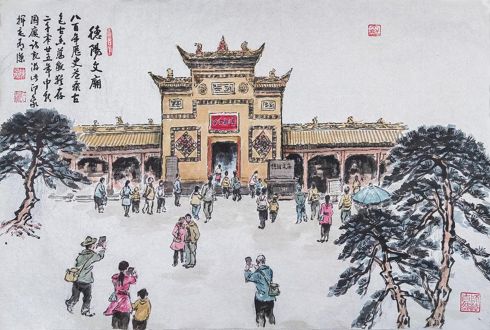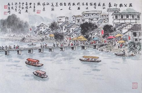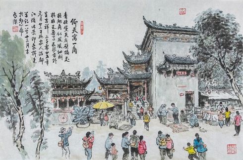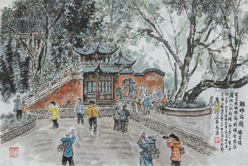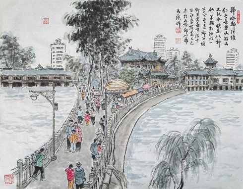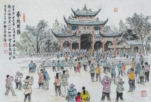 陈有杰先生的写生画作不仅是自然景观的记录,更是人文精神的载体。《南桥揽胜》中熙攘的游人,《古韵流芳》中斑驳的老街,《离堆公园》中静谧的园林,都成为画家表达爱国、爱民情怀的媒介。通过将众多游人热切游览等丰富人物活动融入山水画中,画家打破了传统山水画的程式化表现,赋予作品更多的生活气息与时代精神。