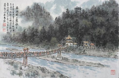 "大胆取舍"是陈有杰先生创作的重要方法论。在《安澜桥上荡悠悠》中,画家没有简单复制索桥的物理形态,而是通过留白与概括,将观众的注意力引向桥下奔涌的江水与桥上嬉戏的游人。这种艺术处理不仅强化了画面的动感,更隐喻了都江堰工程"道法自然"的哲学智慧。