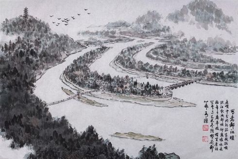 《飞沙堰》的创作体现了画家对传统技法的创造性转化。他将飞沙堰的泄洪排沙功能转化为笔墨语言,通过虚实相生的手法,让观众在墨色浓淡间感受到水利工程的精妙设计。这种"以形写神"的创作理念,使静态的画面充满了动态的生命力。