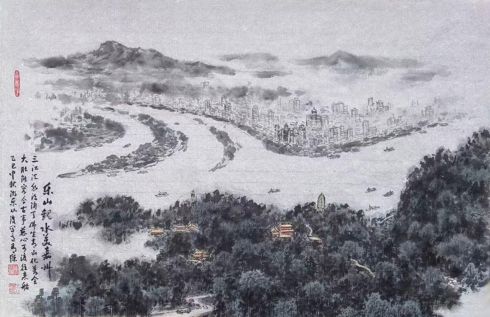 陈有杰先生以独特的艺术视角,将都江堰这一世界文化遗产转化为水墨语言。他在《大美都江堰》中运用的"三远法",不仅是对中国传统山水画技法的传承,更是对华夏文明智慧的现代诠释。高远法展现的玉垒阁云海,深远法勾勒的二王庙幽境,平远法铺陈的江流如带,共同构成了一幅立体化的民族精神图景。