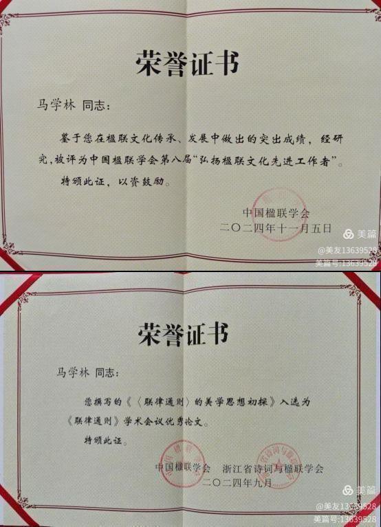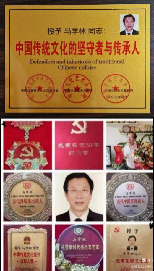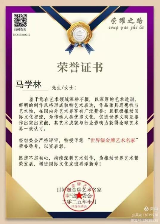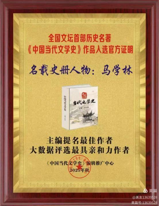 2024 年 12 月获教科文艺术大师、获世界艺术影响力领袖、全球艺术巨匠勋章;2024 年 12 月,获联合国文化艺术丰碑奖、联合国艺术荣誉勋章、联合国艺术杰出代言人、全人类共同文化遗产守获者、联合囯文化艺术评审委员会终身副主席。2025 年 2 月被聘为香港国际商会终身名誉主席。3 月,作品在“雅集京华-诗词百家”获全国第八届诗词大会“一等奖,并被授于“新时代诗词文化践行者”荣誉称号;4 月,获(雅集京华《第八届百家诗会》一等奖,被授于“新时代诗词文化践行者”荣誉称号、同月,被善菊香港国际艺术研究院聘为“艺术顾问”;5 月,获大美东方第三届全国诗诗词大赛“金奖”,由中国科学文化出版社出版(马学林著《百首诗词颂时代楷模拜四俊》200首诗);6 月,获“中华诗词文化的坚守者与继承人”、和“国宝大师”荣誉称号;作品在“大美东方”第三届全国诗诗词作品大赛中荣获金奖”,获第四届矛盾文学杯全国文学艺术大赛“金奖”。到 2025 年 10 月写有 24300 多首格律诗。”制作美篇 2490 多篇、制作小年糕 500 多篇。出版个性化纪念邮册 3 本,诗集 4 本;待出诗集 40 余本、评论集 1 本、论文集 1本、获奖作品集 1 本。同月,获中共中央颁发“七一勋章”和“七一勋章证书;还被中国共产党中央宣传部、国家发展改革委员会、文化和旅游部、人民日报社、中国文联和中国美术家协会六部委共同授“感动中国人物”荣誉称号。被诺贝尔奖文学研究院聘“终身文学顾问”;论文《论非物质文化遗产视域下楹联的学思想研究》入编中国楹联学会《非遗里的楹联论文集》。7 月,(《爱党爱国爱人民》马学林诗词颂歌 20位中国之父人物)的书由中国科学文化出版社出版。8月,作品入编(《中国当代才子佳人传世诗文典藏》作家出版社)。获中国 CCTV 央视新闻官网终身荣誉顾问(厚德载物,德艺双馨)、获“民族解放与世界和平艺术奖”、“忠党爱国人民艺术家”荣誉称号。9 月,作品入选当代文学界唯一历史大典《中国当代文学史》,评选为“名载史册人物”、“主编提名最佳作者”、“大数据评选最具亲和力作者”!作品《舣舟千载忆东坡》经知名作家、诗人及学者组成的评委会无记名投票,在中国当代“才子佳人传世诗文”大赛中荣获“优秀奖”,并获荣誉证书。10 月,国庆节获“鲁迅文化杯全国第三届文学艺术大赛一等奖”。获“亚州文化艺术首席主席”荣誉称号。