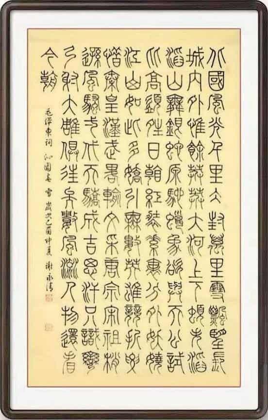 当我们将目光定格在谢永清先生的篆书作品时,书中那种古典的士子格调,更是会从笔笔铁线中扑面而来。他以《泰山刻石》的玉筋格调为基础,又深度研学李阳冰之笔风,将铁线篆法于当今书坛重现风采。整体章法空间更是具有极强的构成意识,方圆有致,转运流畅,由此集字成篇,不禁让人联想到古人所言:“即一字之法,贵在结构:一笔之法妙在起止。结构之道,尤在乎笔法之精妙也。”与古人笔意相连接,与古人情思相融通,谢永清先生的篆书,正如同是千年古琴上流淌的清音,可以在当代书坛奏响一曲典雅之乐,有古法可循,令世人叹服!