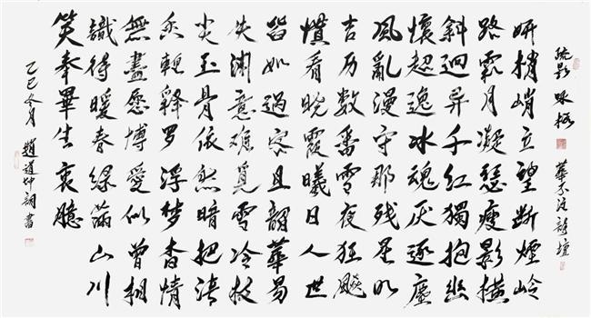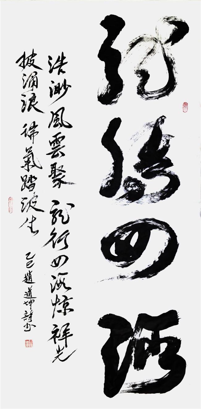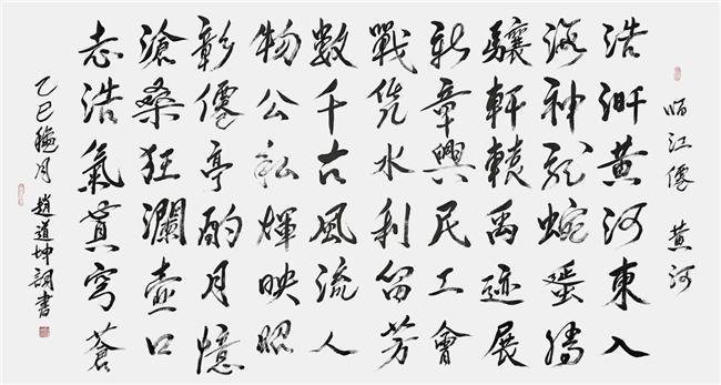 赵道坤先生的书法历练生涯,是对传统的回归与超越的并进之旅。他深谙古典诗词精髓,文学才华相当突出,作为文学家、诗人可以将其文学意境融入书法创作,使每一幅作品都与诗篇相伴,书法的内涵丰神迵异,当然写得与众不同。其书法特别笔墨线条的塑造机理,带着完全切合中国传统美学内涵的动向,执笔在于,凌空杀纸,落笔则是抓铁留痕,踏石有迹的精气神,书法风骨是钢打铁铸的浩荡气质,不糜不板,一挥而就,痛快淋漓。复作鸾凤徘徊,间以牵丝映带,在风骨独立的笔墨空间里,又有上善若水的刚柔相济。柔则云出山崆本无意,刚则铁柱将立千钧落,快如惊雷驰电,慢作落花飞雪,书法线条类万物之象,恰有用笔千古不易的真谛!又以及结构布局妙造空间,再渡以情感表达,书法作品便都是以书抒怀意境营造的最高境界,历代贤家书法,莫不如是。