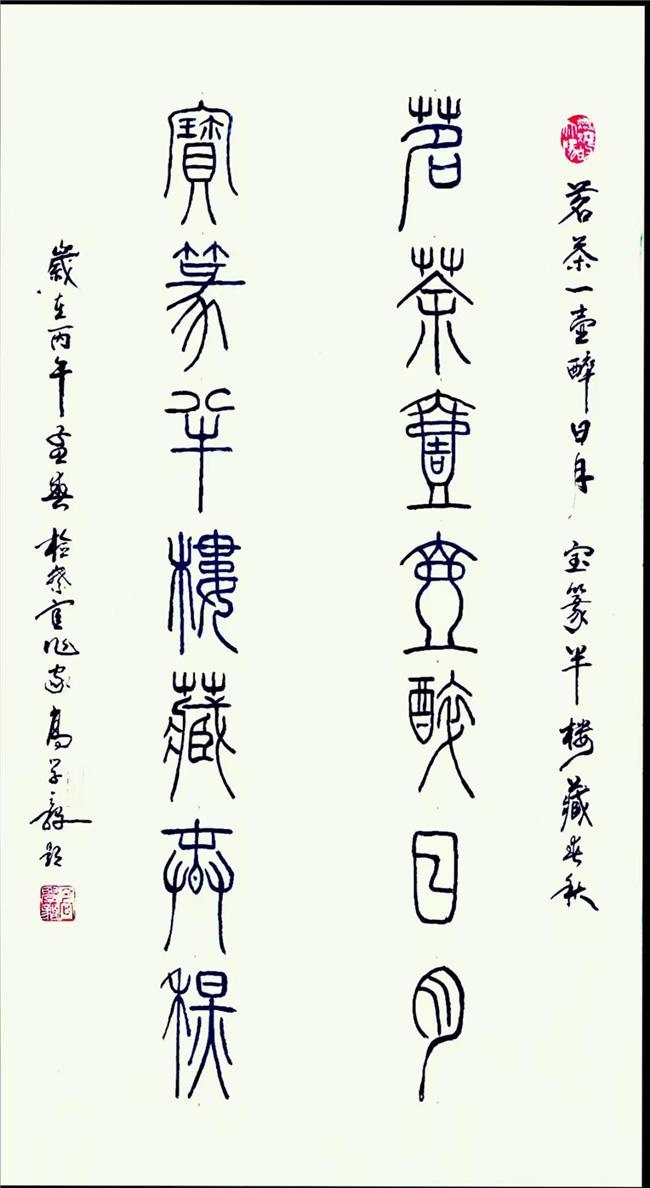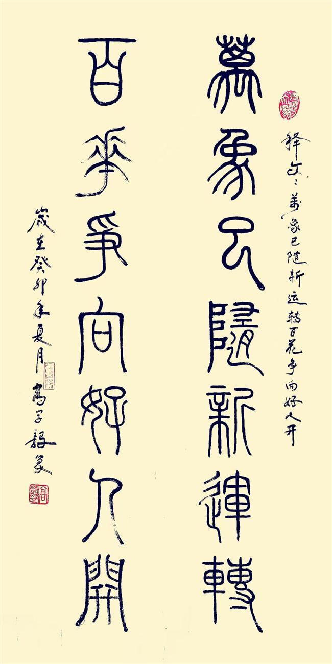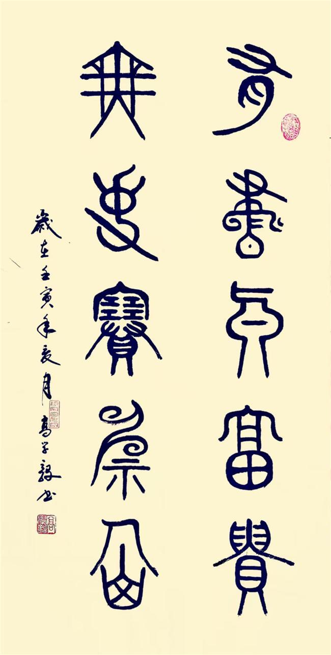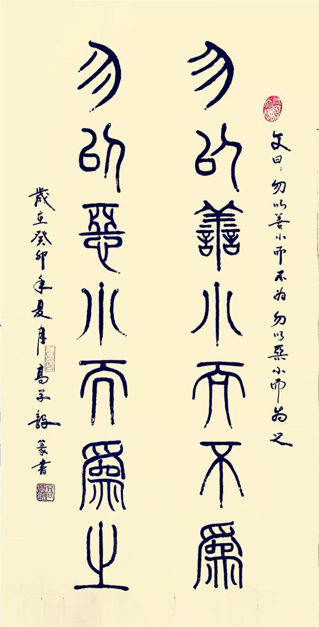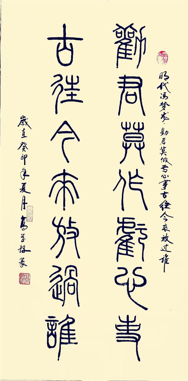每个人书法艺术的底蕴积淀,必源自对历代经典的深刻研悟与临池积累,高学毅先生也不例外。他琢磨《泰山刻石》《峄山碑》等秦篆典范用工极深,又对二王法帖行草经典有着系统研习经历,可以借古开今地致力于让书法的笔墨精神与审美理想前后相续。于是他所创作篆书作品,其线条凝练如玉箸,内含弹性与力度,干净利落相当耐看,既具“婉而通”的流转韵致,又蕴含金石镌刻般的凝练质感,笔意于匀整中见生机。结体远承秦篆对称平衡的法度,又在严整中寓有变化,通过字形长短、空间虚实的微妙调控,在端庄中注入灵动意趣,可以将古朴的金石气焕发为当代刚健的书卷气,整体写的雅逸灵动,端正典范,实现了书法法度与意趣抒发的高度统一,让当代篆书在形制和精神层面同时达成了新境界。