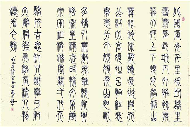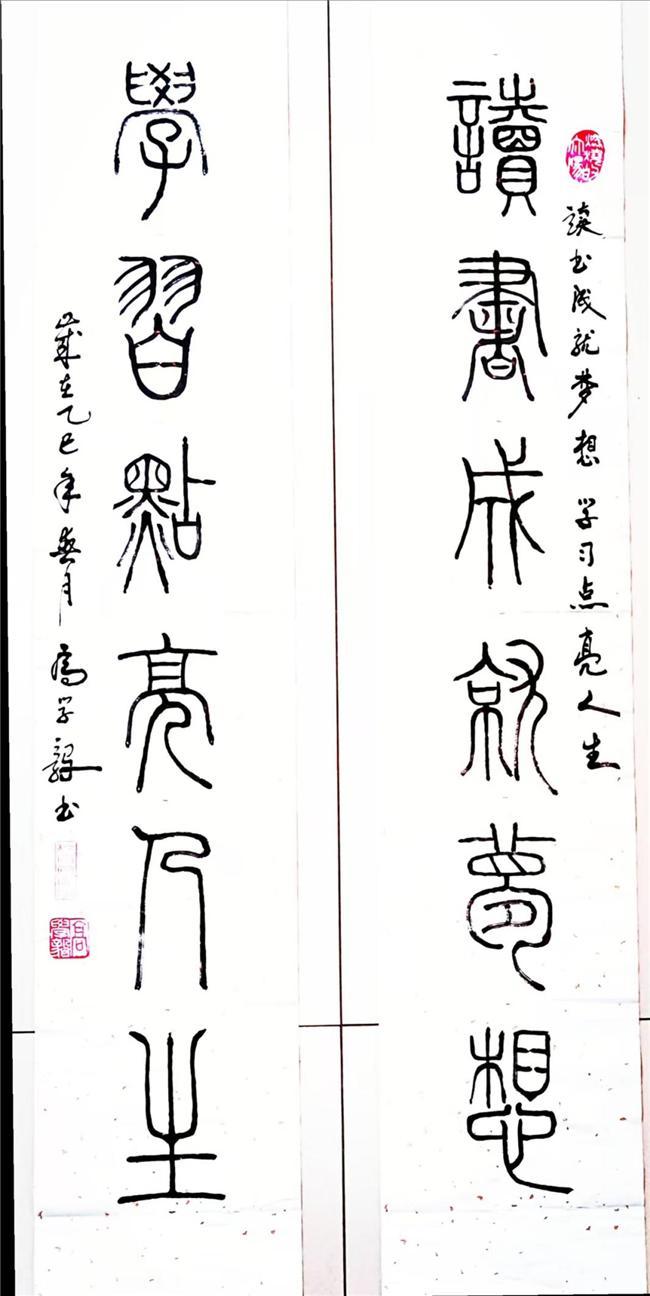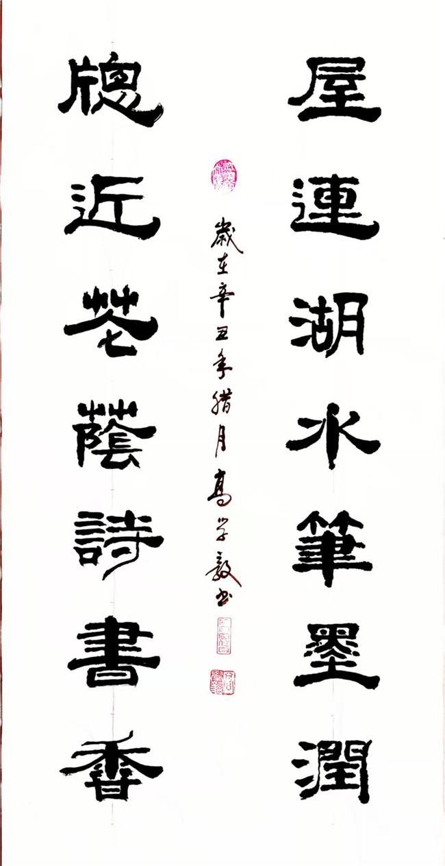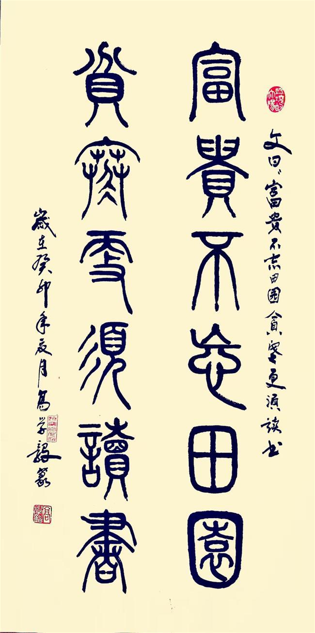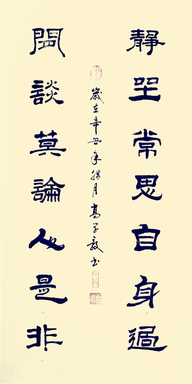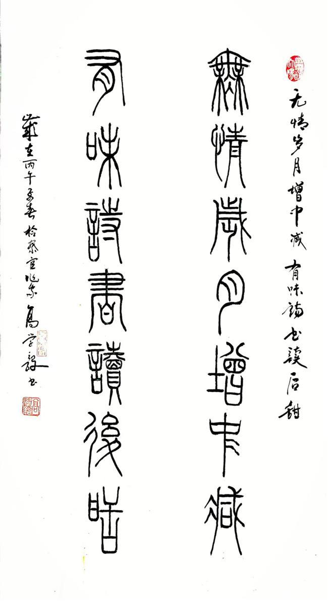 每个人书法艺术的底蕴积淀,必源自对历代经典的深刻研悟与临池积累,高学毅先生也不例外。他琢磨《泰山刻石》《峄山碑》等秦篆典范用工极深,又对二王法帖行草经典有着系统研习经历,可以借古开今地致力于让书法的笔墨精神与审美理想前后相续。于是他所创作篆书作品,其线条凝练如玉箸,内含弹性与力度,干净利落相当耐看,既具“婉而通”的流转韵致,又蕴含金石镌刻般的凝练质感,笔意于匀整中见生机。结体远承秦篆对称平衡的法度,又在严整中寓有变化,通过字形长短、空间虚实的微妙调控,在端庄中注入灵动意趣,可以将古朴的金石气焕发为当代刚健的书卷气,整体写的雅逸灵动,端正典范,实现了书法法度与意趣抒发的高度统一,让当代篆书在形制和精神层面同时达成了新境界。