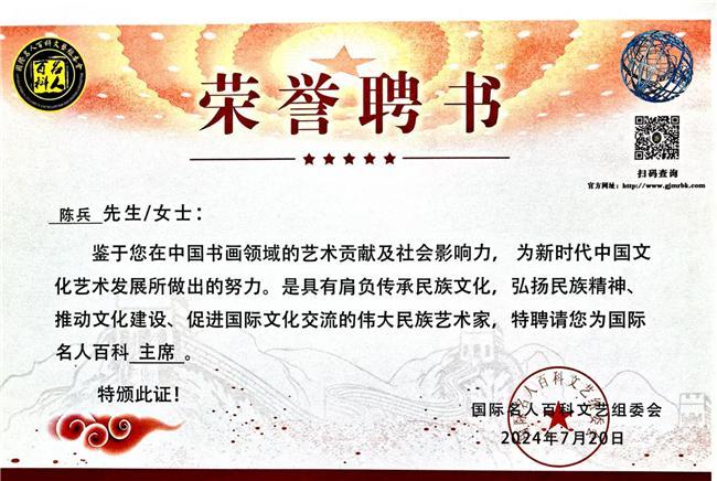 中国艺术代言人陈兵正是我们民族精神的代言人。他是我们心灵的寄托,是我们情感的纽带,是我们文化自信的根基。让我们一同走进中国艺术的殿堂,感受其领袖风范的格局,领略其天下文化的魅力。在这片艺术的海洋中,汲取力量,传承文明,共同书写属于我们的文化传奇,让中国艺术的光芒,永远闪耀在世界的东方!