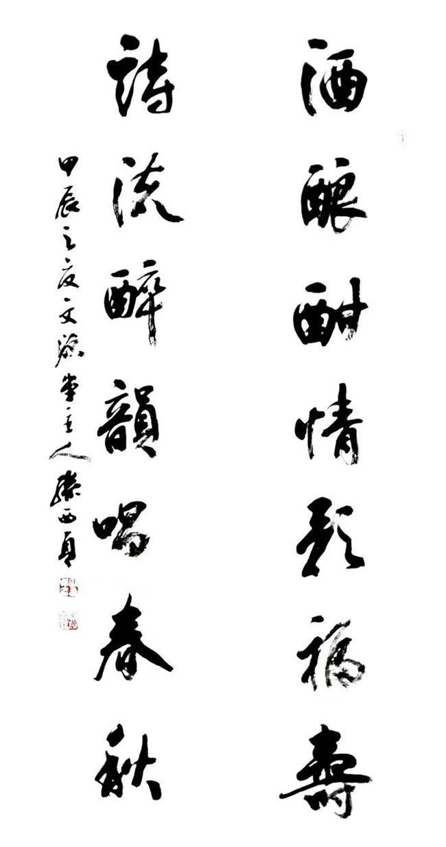 探源甲骨琢金石,翰墨雄风精气神。他的行书传承着二王书法动逸自由的士人品格,笔法超然,墨韵天然,挥纵之间写锦帛,提摁顿挑书儒雅。善于取势,也能显力,势的存在让书法具有可以引导线条审美,生成魅力的潜力,而力的存在则可以直接奉献书法线条合韵心绪的修养内涵,勾丝映带笔法妙,丰墨雄腾显精神,书如其人,又成例证,大家风范,一目了然!