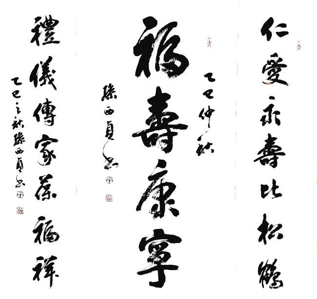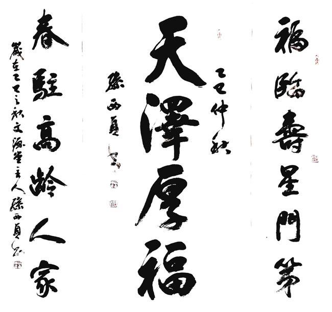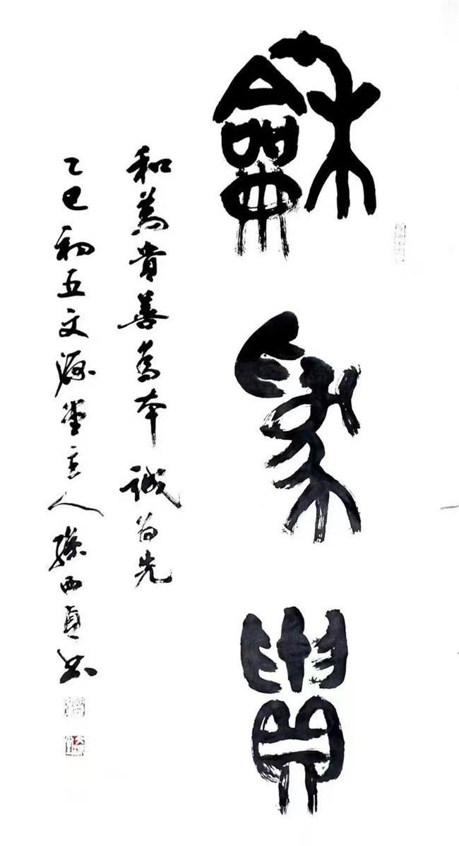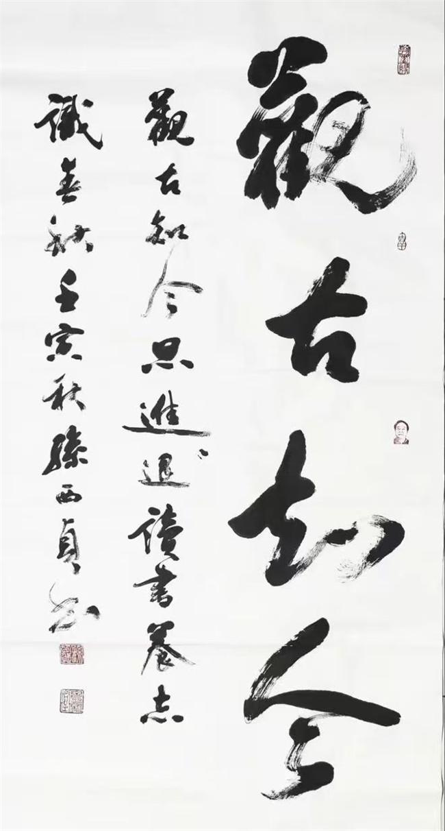 经由甲骨文的研究与创作,他的书法从源头而出,再沿周、秦两朝的发展路径,对金鼎石鼓也进行了全面研习,刻琢金石,铁笔劲墨,有劲趋道,让他的书法生成了雄劲圆厚的翰墨技法的另一种底色。从而合成了他的书法劲感十足,气象变幻,卓健非凡的至上品格。而种品格的存在,正是历代书法家追求达成的主流风格,魏晋王献之的笔墨如此,唐代颜真卿的笔墨如此,宋代苏东坡的笔墨如此,当代孙西贞先生的笔墨也是如此。所以他的书法因结体弘劲,墨感丰硕,而成为传承中国书法精气神的当代典范。