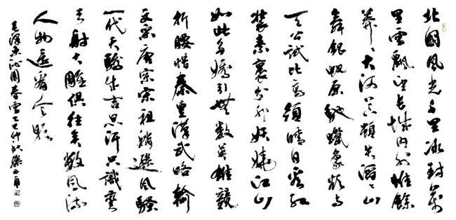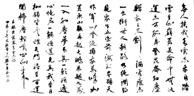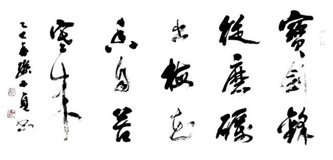 他的在行草创作,在法度精研的基础上,又可以作出遂心应手的个性表达。把书法本为线条艺术的真谛,表达得无以复加。可以在一划之间变起伏于锋杪,也能够在一点之内殊衄挫于毫芒。侧入中行,用笔如凌空杀纸,可以作中流击楫,把书法的提按顿挫铺陈成速度与力度的精彩。快写一笔如惊雷驰电,慢作一笔若落花飞雪。或重如崩云,或轻如蝉翼,笔里有墨,墨里有笔,导之如泉,顿之山安,果然是心手相师势转奇,志在出新无定则!行笔运笔,皆是能在险中求稳重,在势中求屹立,绝无轻浮软歪之弊,更无张扬俗味之嫌!不求为佳,反为最佳,左蹙右盼如惊电,状如楚汉相攻战!起笔落笔,可作金书锦字是也!