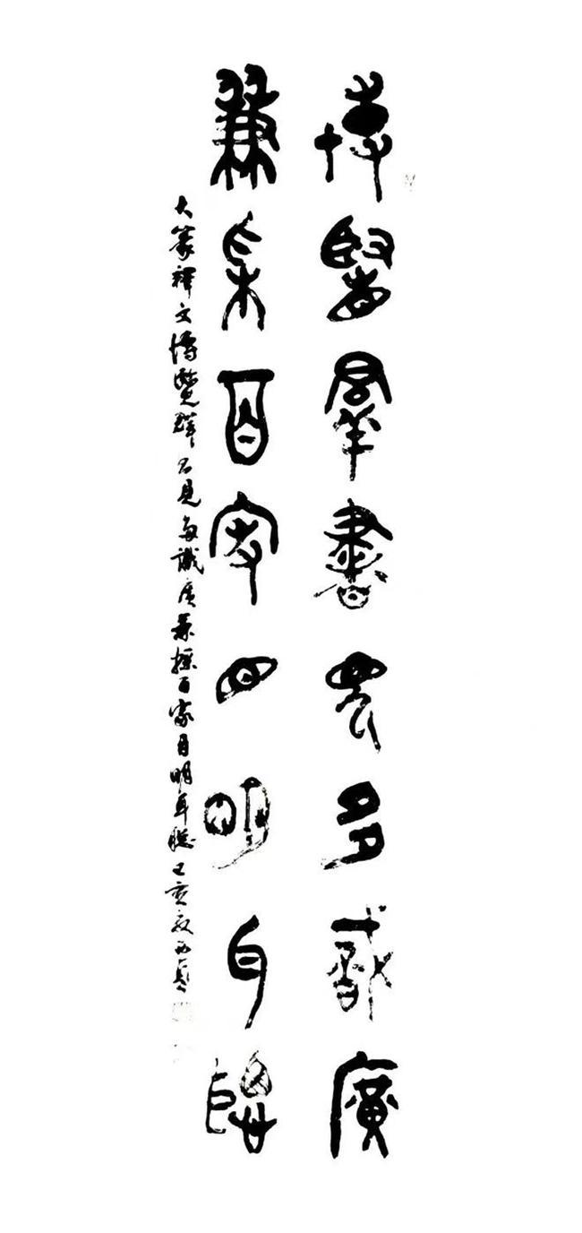 他是站在探源文化的高度上,深刻体验翰墨五千年的法源流变,所以书法修炼的源头就深入了古文字学的研究范畴,对甲骨文有非常深厚的探研积淀,读尽甲骨四万片,识得文字近千言,执笔书朴茂,刀劲传古风。因为对甲骨文书法有通透全能的识、读、写、创的水准,又把文字学与书法美切意融合,让他的书法拥有了源头朴茂的基础底色,书法的"法"更见周全完备。