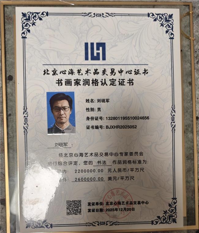 刘砚军(笔名:大清河人)中国北京。祖籍文安,毕业于南京大学。中国荣宝斋唯一签约艺术家,中国高级文学创作师,中华诗词学会会员,中国香港诗人联盟会员。中国社会责任艺术家,中国盛世典藏艺术家,世界顶级艺术宗师,中国国际艺术巅峰十大领袖人物,中国书法艺术创作金奖获得者,中国首届国粹文化金马奖获得者。中国第十二届规范汉字书写(软笔)金奖获得者,CCTV高级艺术顾问。中国《人民书画报》理事会特邀艺术顾问,中国纪实文学研究会副秘书长,中国东方文化研究会特邀艺术顾问,中国互联网联盟艺术总监,中国非物质文化遗产高级书法传承人。