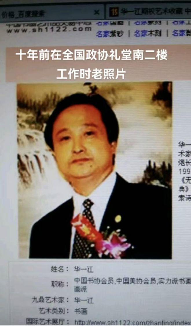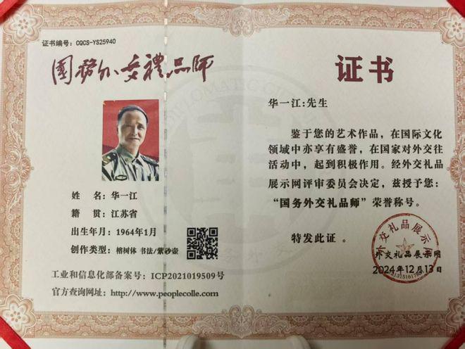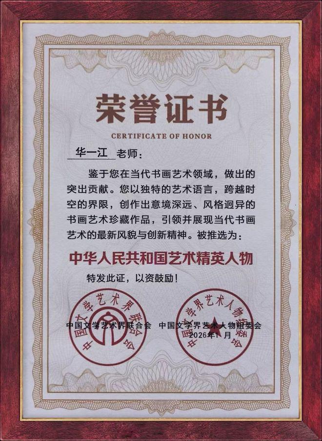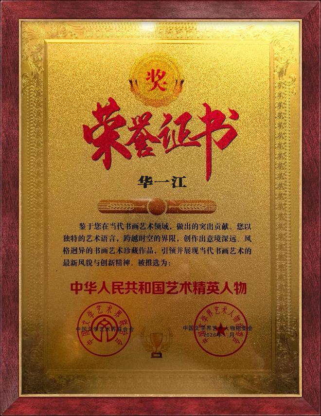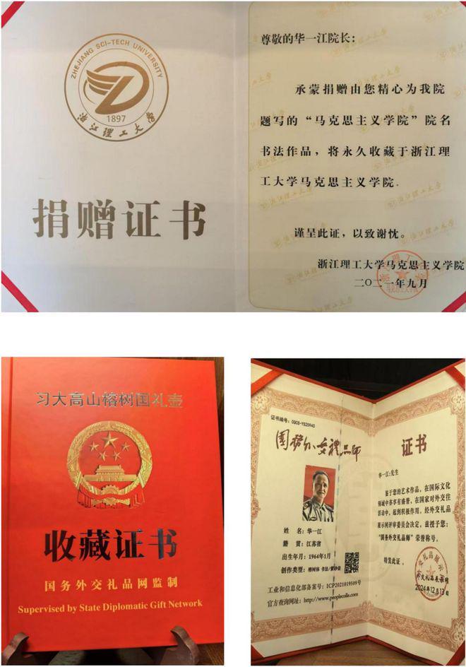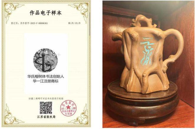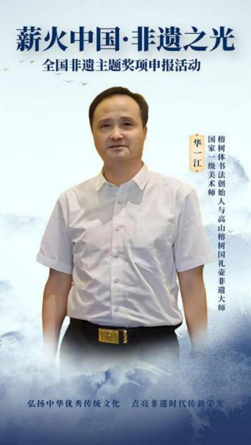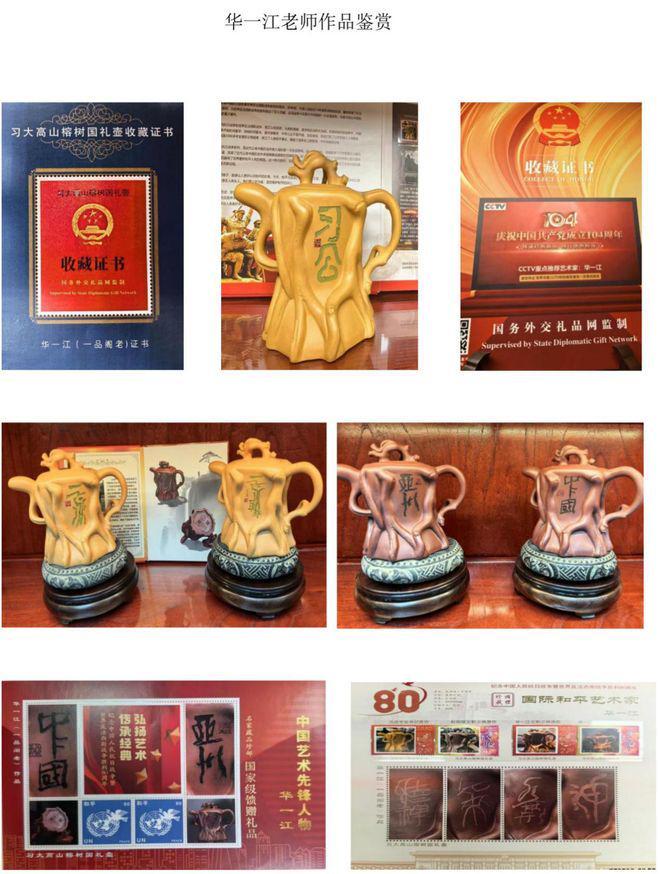 中国华氏榕树体书法艺术创始人商标,在国家知识产权局成功注册。以“一品阁老”为著称的中国华氏榕树体书法艺术,在多元化的中国书法艺术史上填补了空白,榕树国礼紫砂壶获外型设计国家专利,中国非遗文化大师传承人,中国丝绸之路申遗团专家成员,中国书画家研究会文化艺术委员会专家顾问团成员。诺贝尔艺术奖获得者。2025 年七月庆祝建党 104 周年之际由 CCTV 央视频道为华一江杰出功勋艺术家作了重点专题报道,CCTV《文化强国》栏目重点推荐了“习大高山榕树国礼壶〞专题报道,成为全球华人十大杰出艺术家桂冠,在党政军的关心与支持下,华一江教授的中国华氏榕树体书画艺术在北,上.广,深,杭等举办了高规格的全国巡展,高山榕树国礼紫壶代表作《二泉映月》《二泉听琴》《空灵》《中国亚洲》《天人合一》《榕树》《习公》《羽化无我》《西湖》《丛林》《朋友如镜》《穿月》《家园》《百年树人》等分别被中国国家博物馆,中国美术馆,全国人大人民大会堂,全国政协礼堂,外交部,中央军委,故宫博物院等国家级机构收藏并辑入全国书画艺术家档案馆官网。高山榕树国礼壶在法国巴黎卢浮宫首展并获国际金奖。2026 年始,即将分别举行“华氏榕树体独创艺术.世界非遗大师国际巡展〞,高山榕树国礼壶,获得了国内外各界专业人士广泛的高度赞誉。详情搜见“百度百科”,“搜狗百科〞。