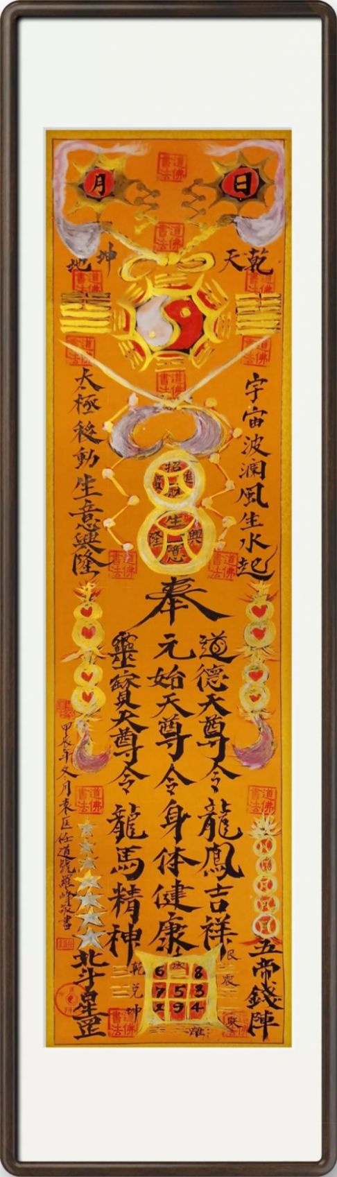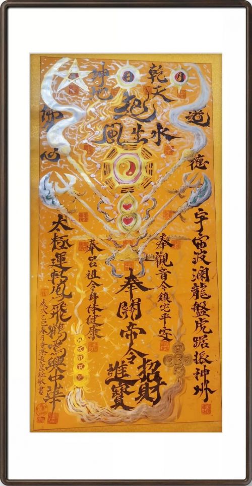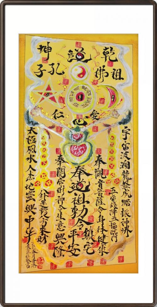 主要元素:日月星辰,冰峰,山河,海洋,旭日,紫气,神鹰,孔道佛,仁爱,慈祥,功德,长寿,养生,养心,关刀,拂尘,葫芦,金钱,金刚经,道德经,春秋经,周易,四书,五经,心经,关帝,观音,吕祖,道祖,佛祖,太极,乾坤,宇宙,北斗,八卦。莲花,莲藕,莲子,道笔,龙凤,镇宅,平安,驱魔僻邪,招财,进宝,生意兴隆,身体健康,财源滚滚,有求必应,天后,黄大仙,天道酬勤,海纳百川,神州,中华。卍,天地,老子,孔子,太上老君,道法自然,佛心,道心。