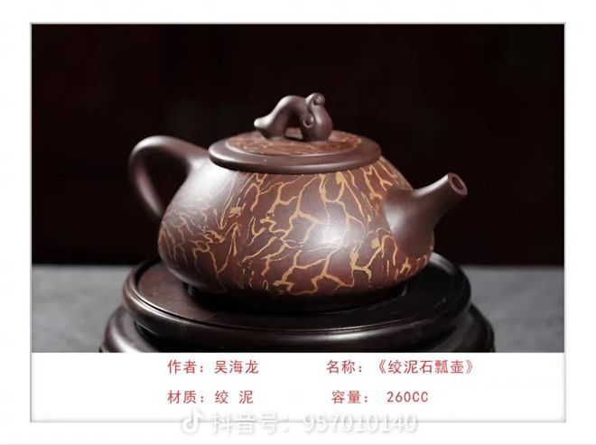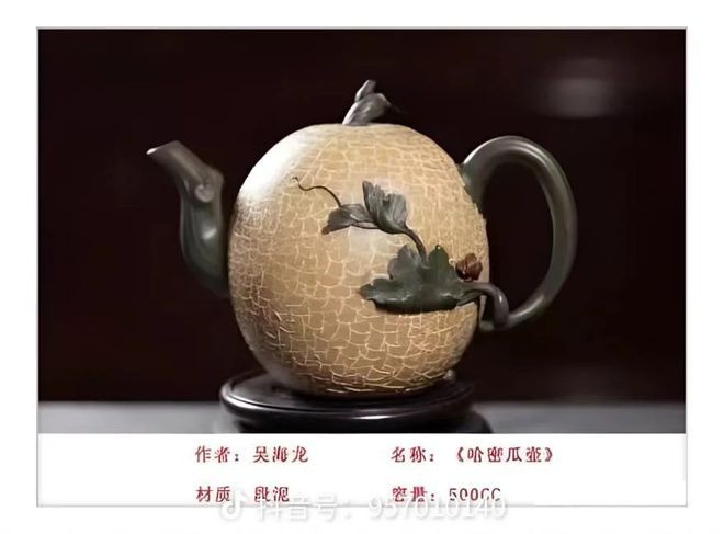 2016年春,吴海龙在清理祖宅时,于一口尘封的紫砂水缸中发现了六十载陈腐的老泥。这些历经半个世纪自然风化的泥料,在窑火中竟绽放出如羊脂玉般温润的光泽。他如获至宝,以此为契机创立“吴氏金鼎”品牌,将祖传绞泥技法与现代美学熔铸一炉。其代表作《哈密瓜壶》以新疆瓜果为形,瓜藤蜿蜒成壶把,瓜叶舒展作壶嘴,段泥烧制出的表皮纹理纤毫毕现,仿佛能嗅到瓜果的清甜。2019年,这件作品在首届“百鹤杯”工艺美术大赛中斩获金奖,被中国轻工业联合会永久收藏,成为当代紫砂艺术与自然对话的典范。
